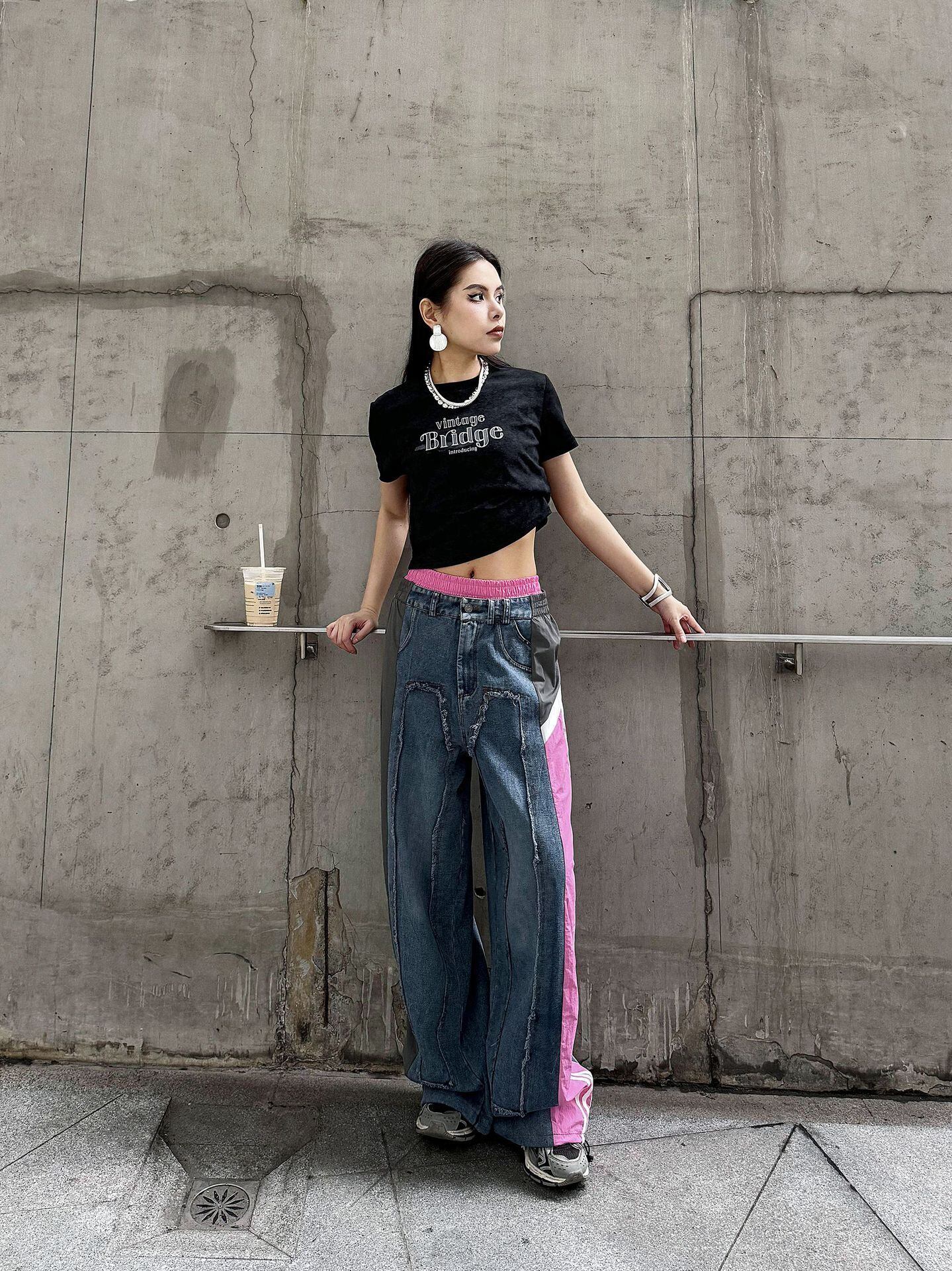サイドライン異素材MIXデニムパンツ デニム ナイロン 切り替え ワイドパンツ レディース 韓国ファッション ストリート系 スポーティー ゆったり Y2K ジーンズ ダンス ズボン 個性派 おしゃれ ストリート 体型カバー 春 夏 秋 冬 新作 ユニセックス カジュアルパンツ aa4835