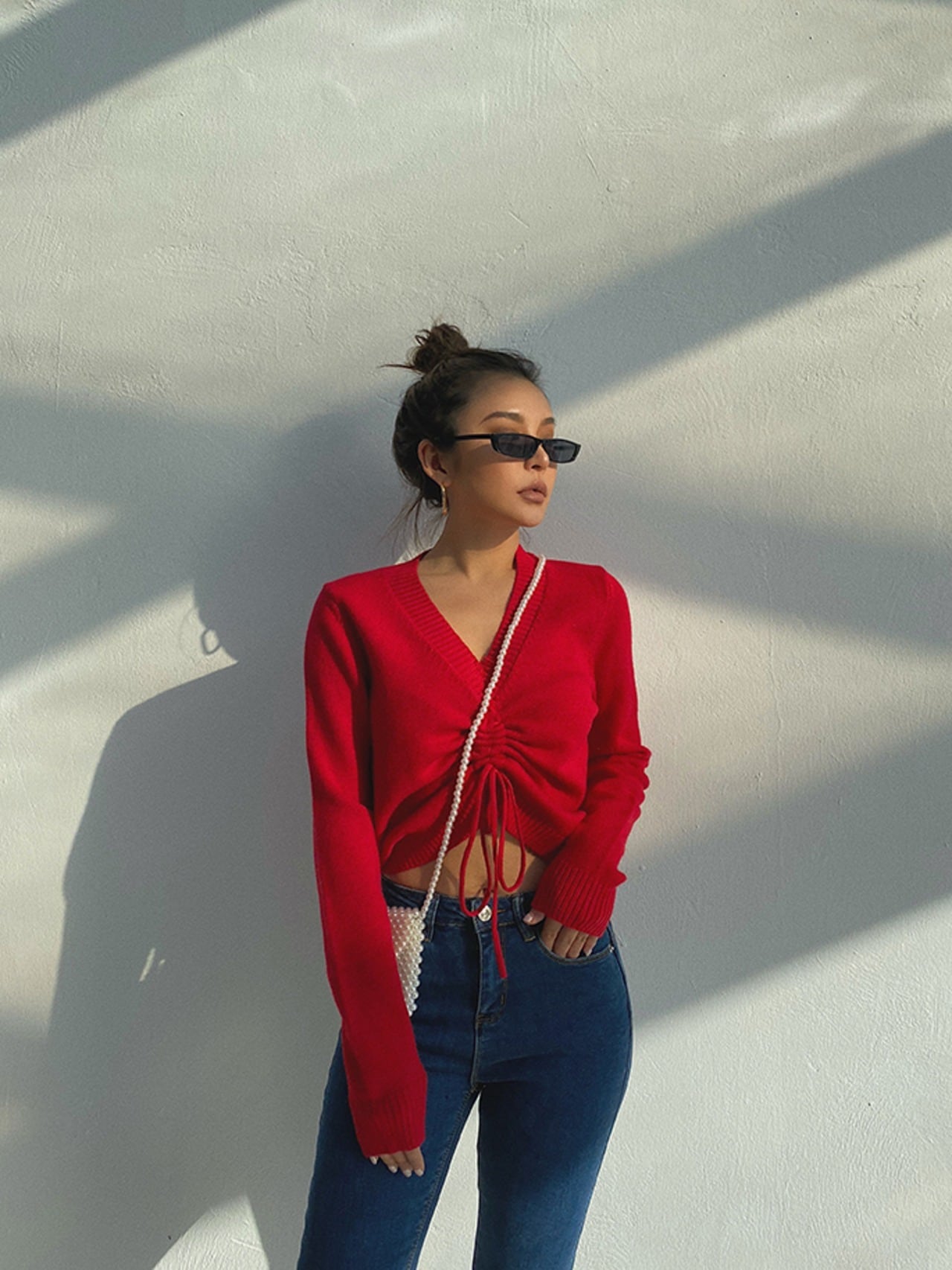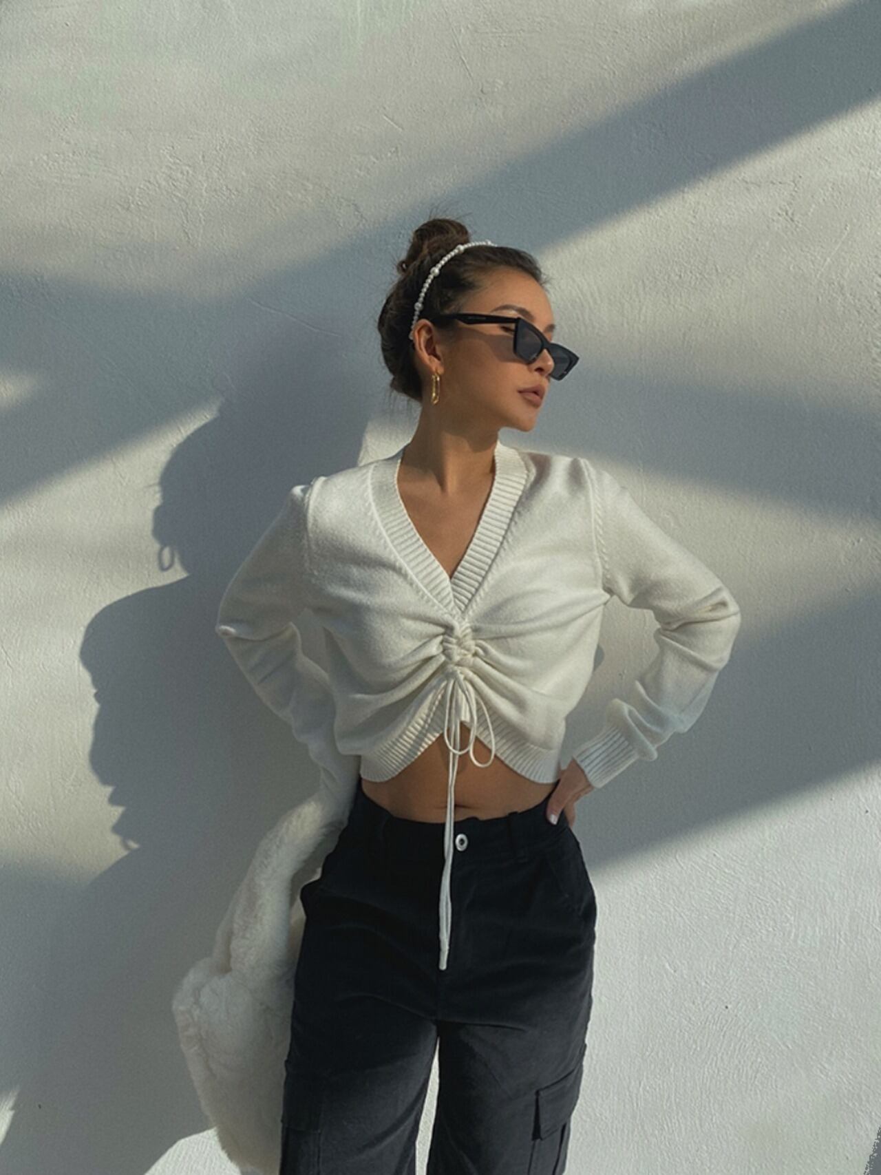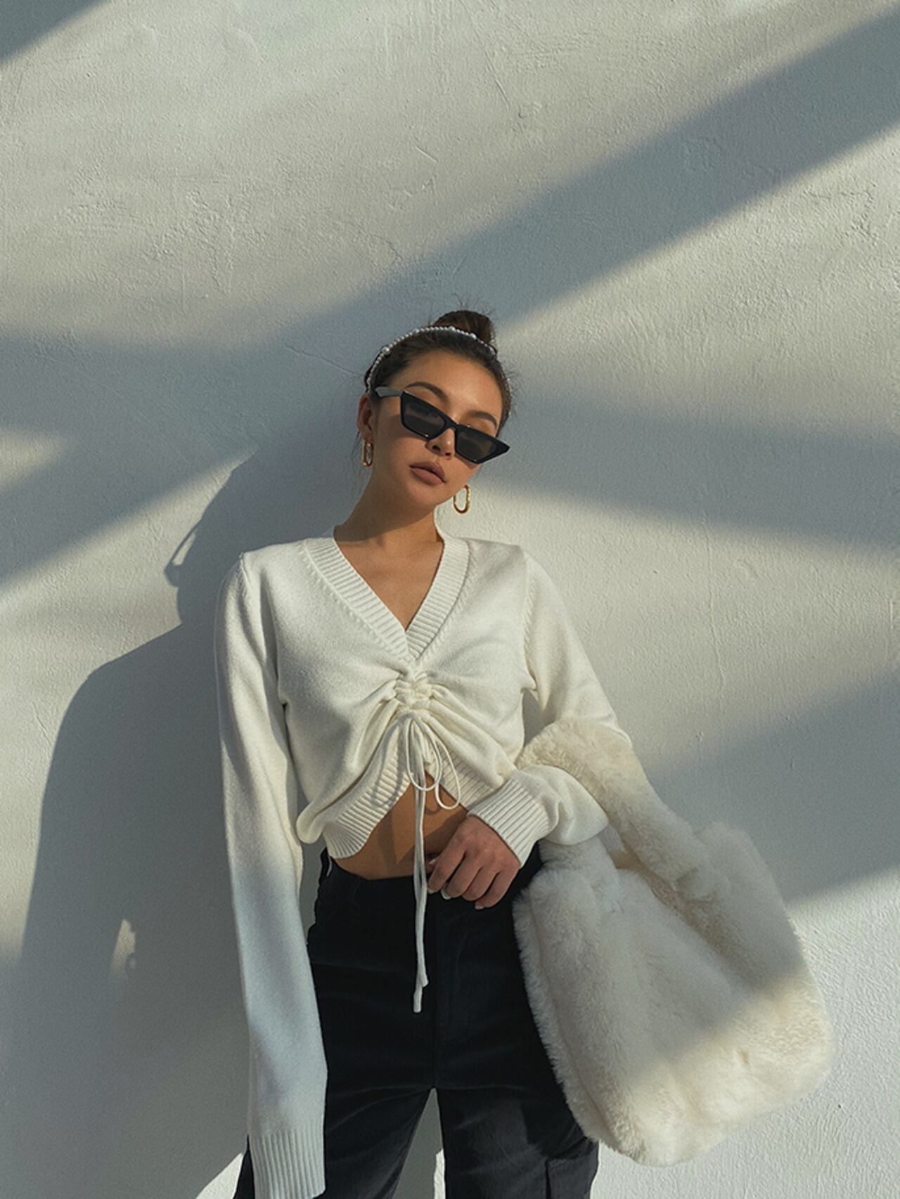 シンプルで上品なVネックデザインのドローストリングニットセーター。