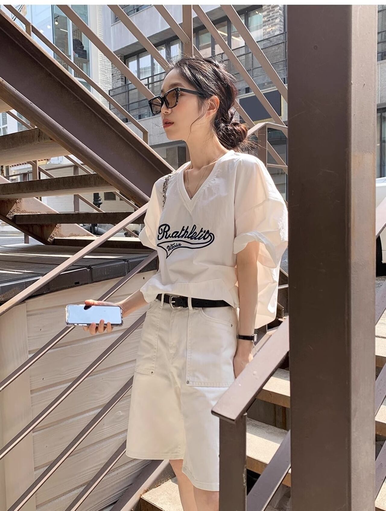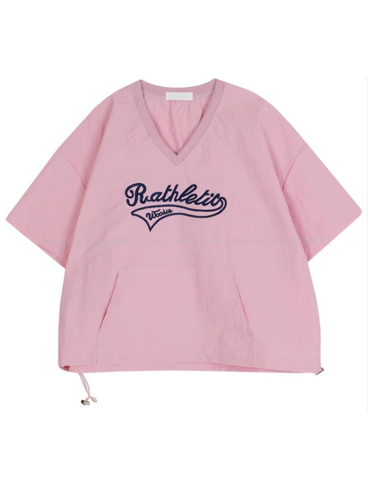 Vネック刺繍Tシャツ 半袖シャツ シャカシャカ レタリングナイロンストリングTトップス ナイロン Tシャツ カットソー 韓国 レディース vネック トップス おしゃれ 綺麗め レディース 春夏 お出掛け 休日コーデ C531