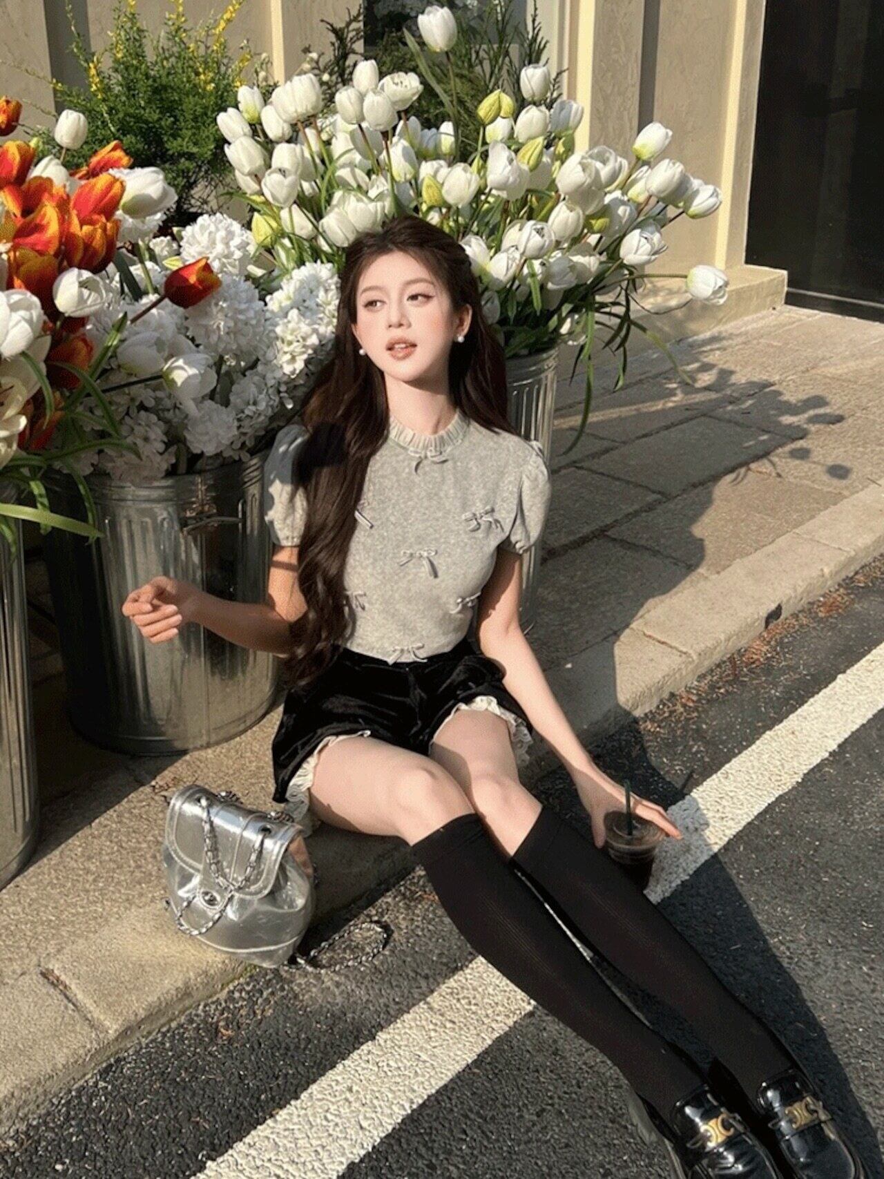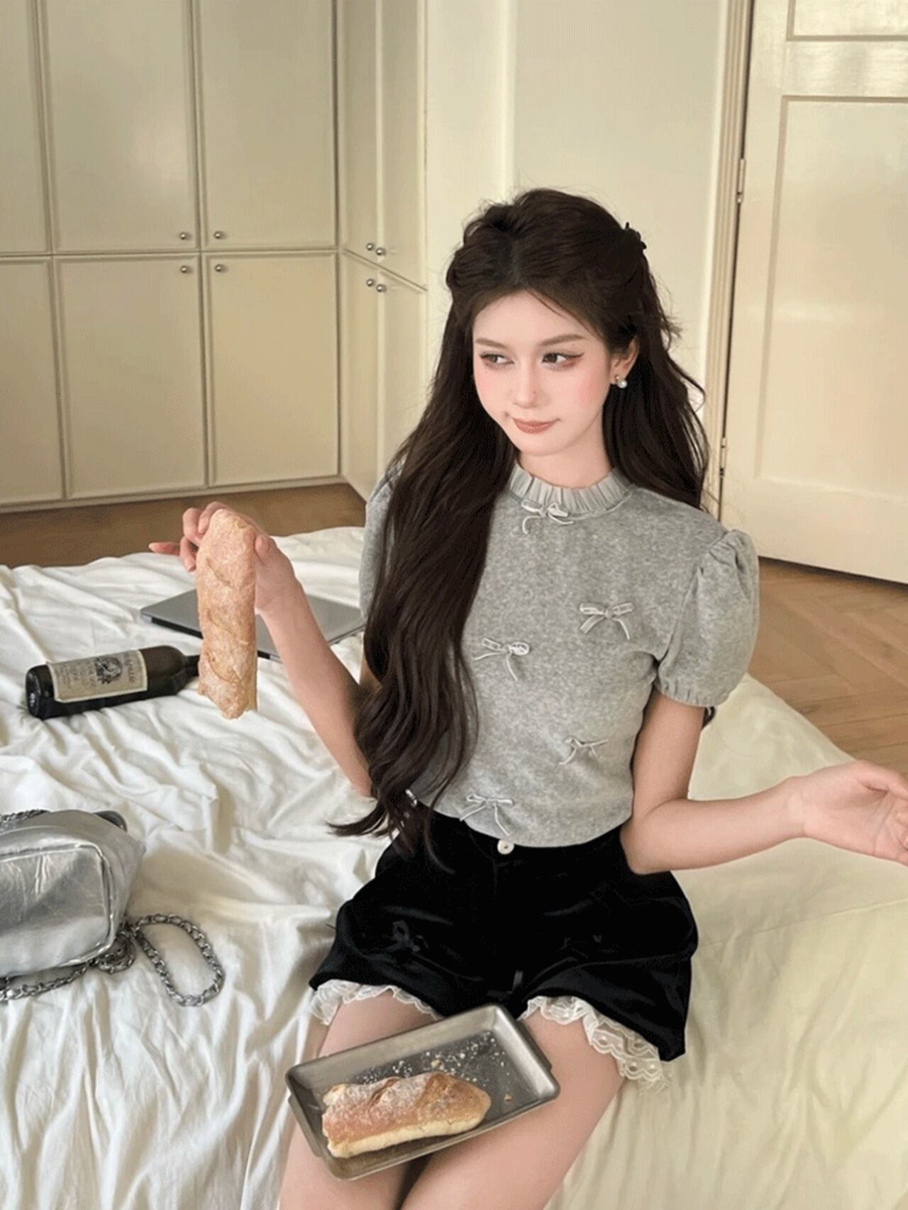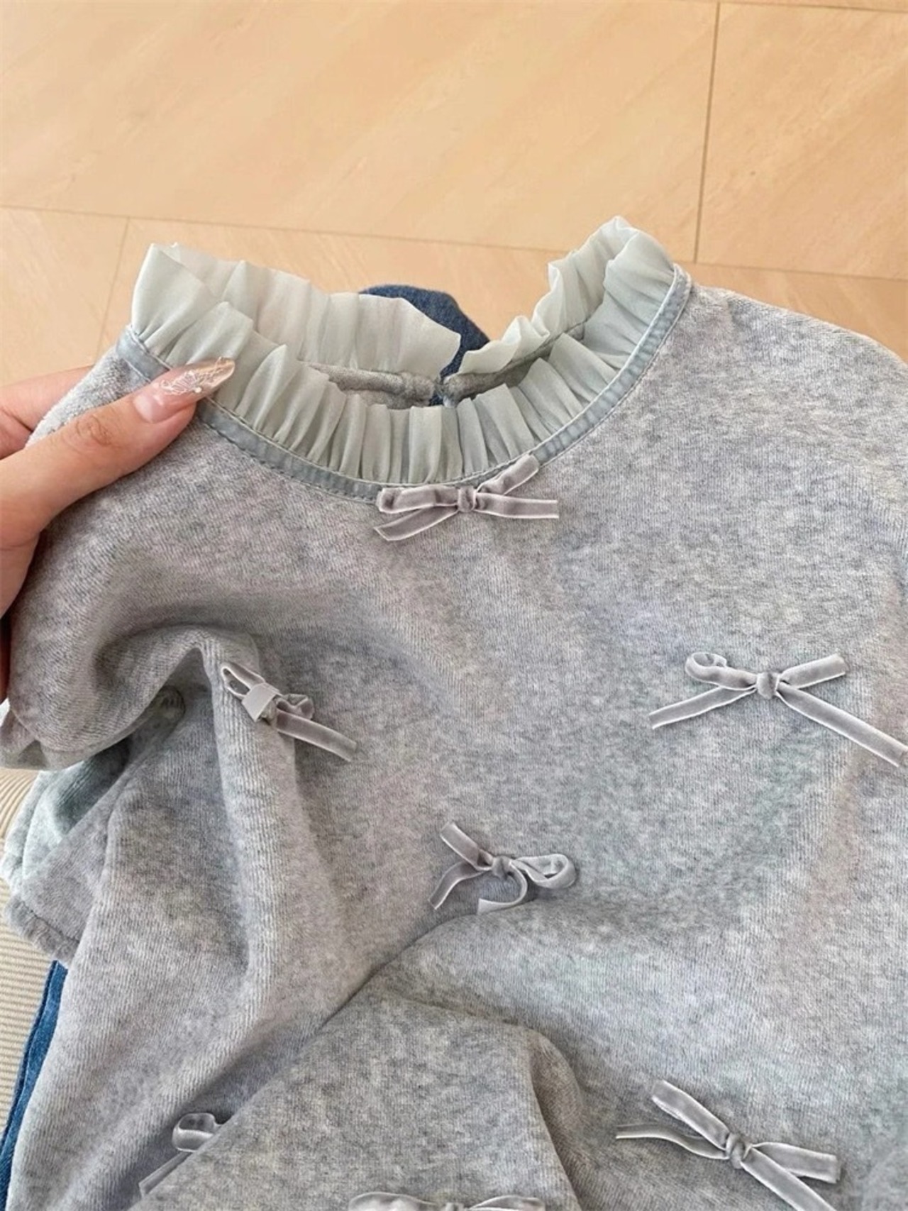 レースフリルネックとパフスリーブが絶妙にデザインされたリボン半袖Tシャツ