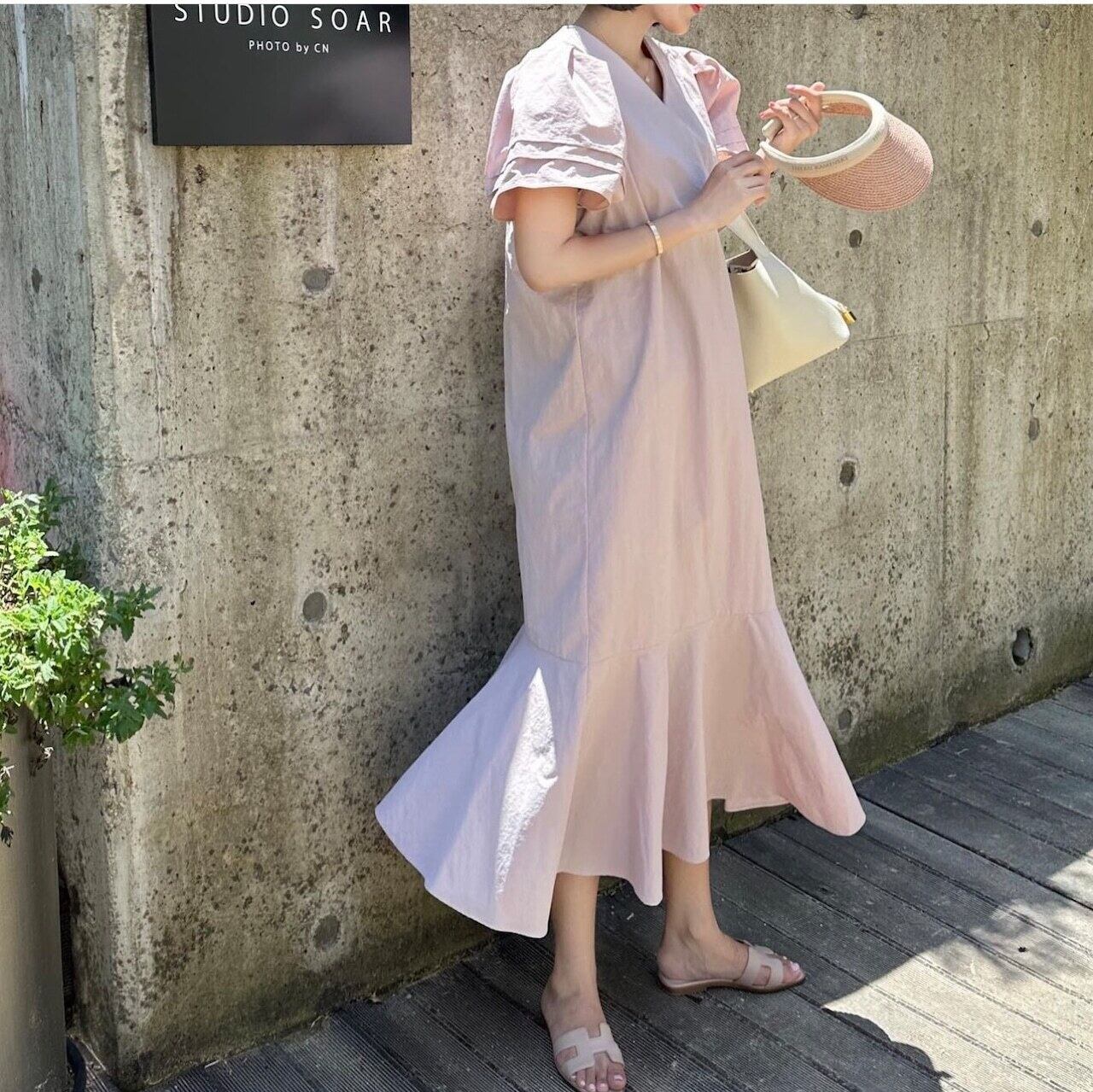 Vネック半袖ワンピース 裾フリルワンピース ワンピース 半袖 春 夏 レディース パフスリーブ Vネック マーメイド ロングワンピース ゆったり マキシワンピース 無地 涼しい ぽわん袖 リラックス 旅行 リゾート カジュアル エレガント シンプル Aフレア 体型カバー フェミニン 華やか 着映え C699