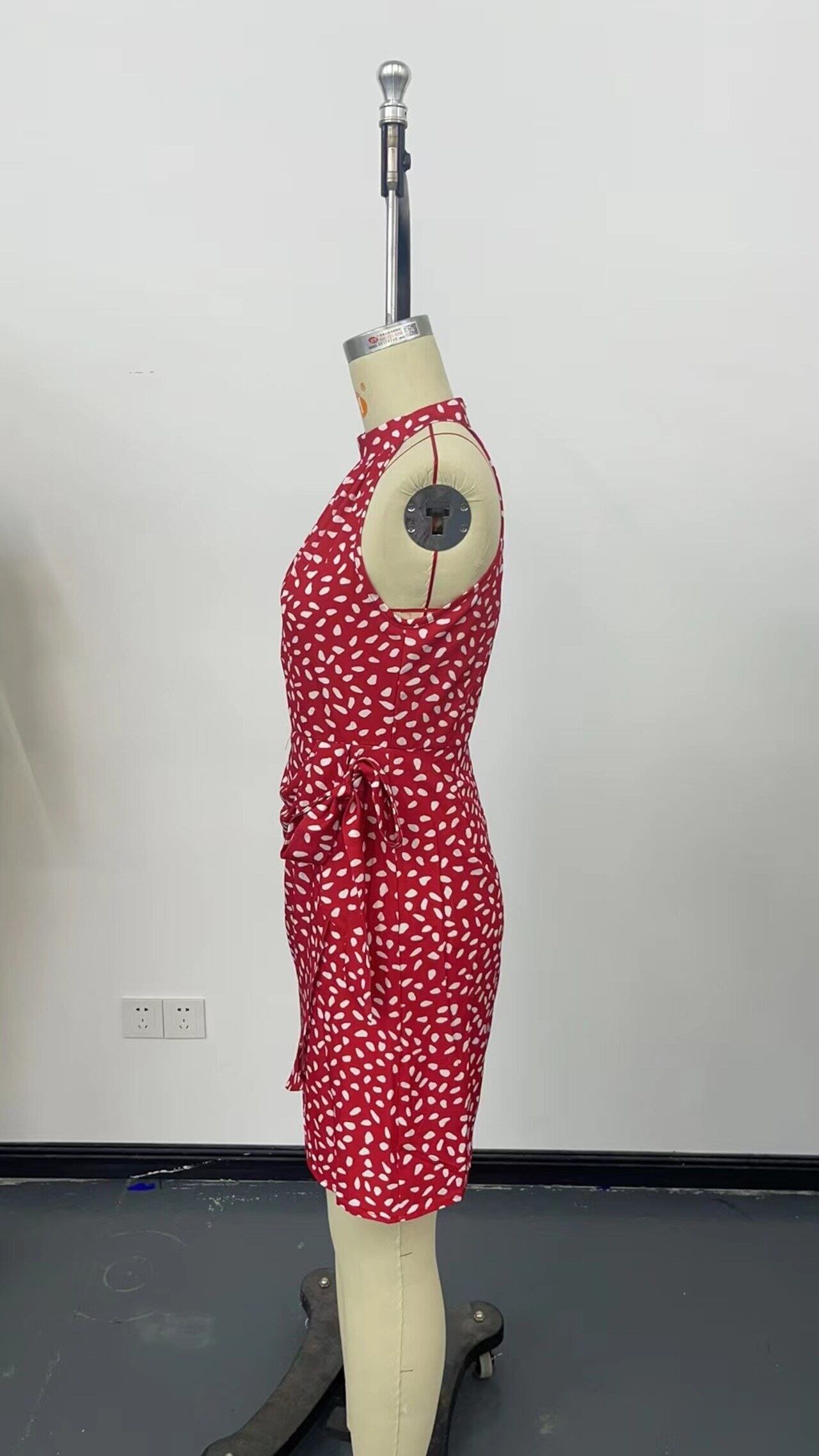 ドット柄ホルターネックワンピース レディース 夏 総柄 ウエストリボン アメスリワンピース ノースリーブ ホルターネック ドレス ワンピース エレガント ドレス C675