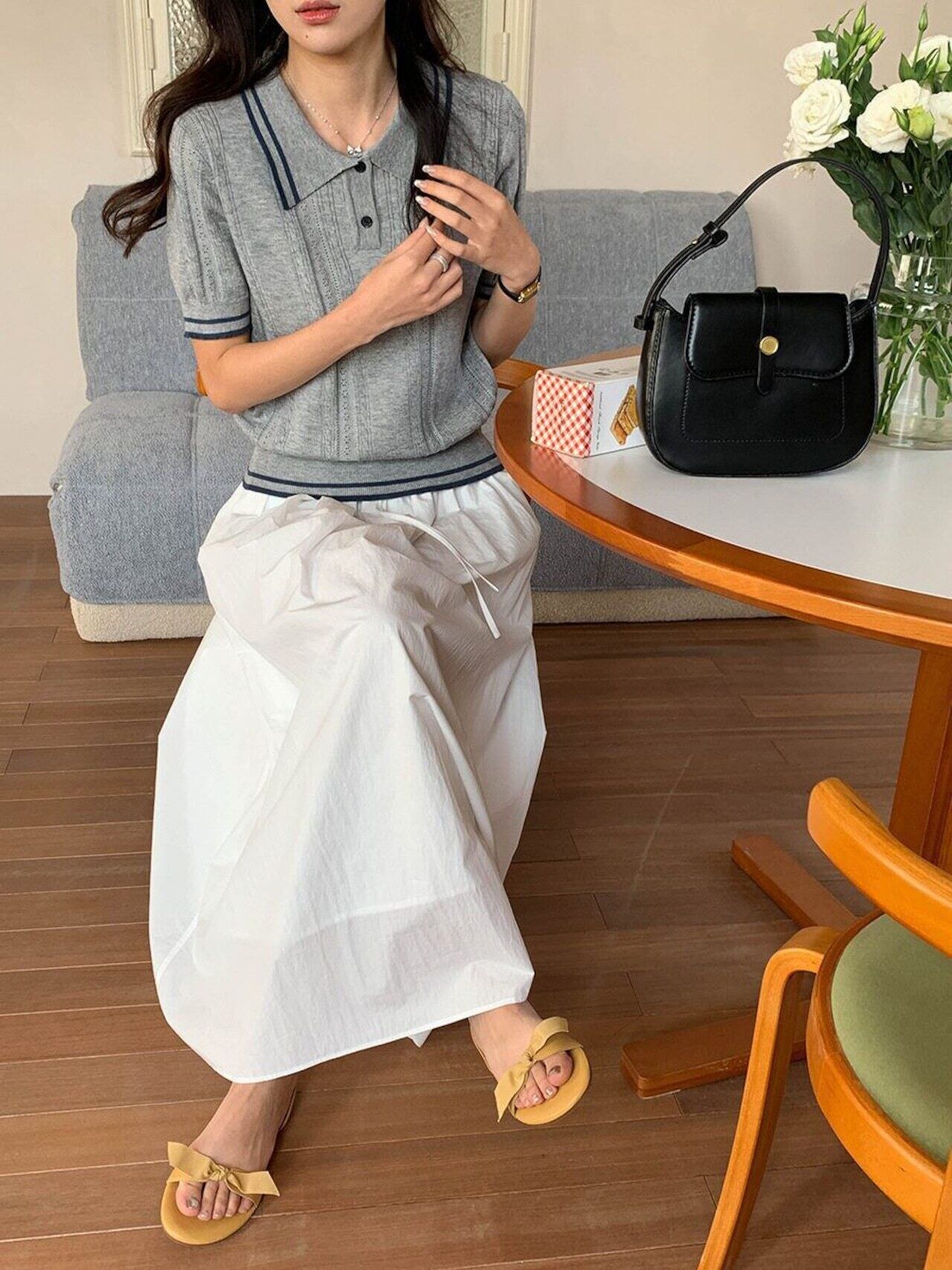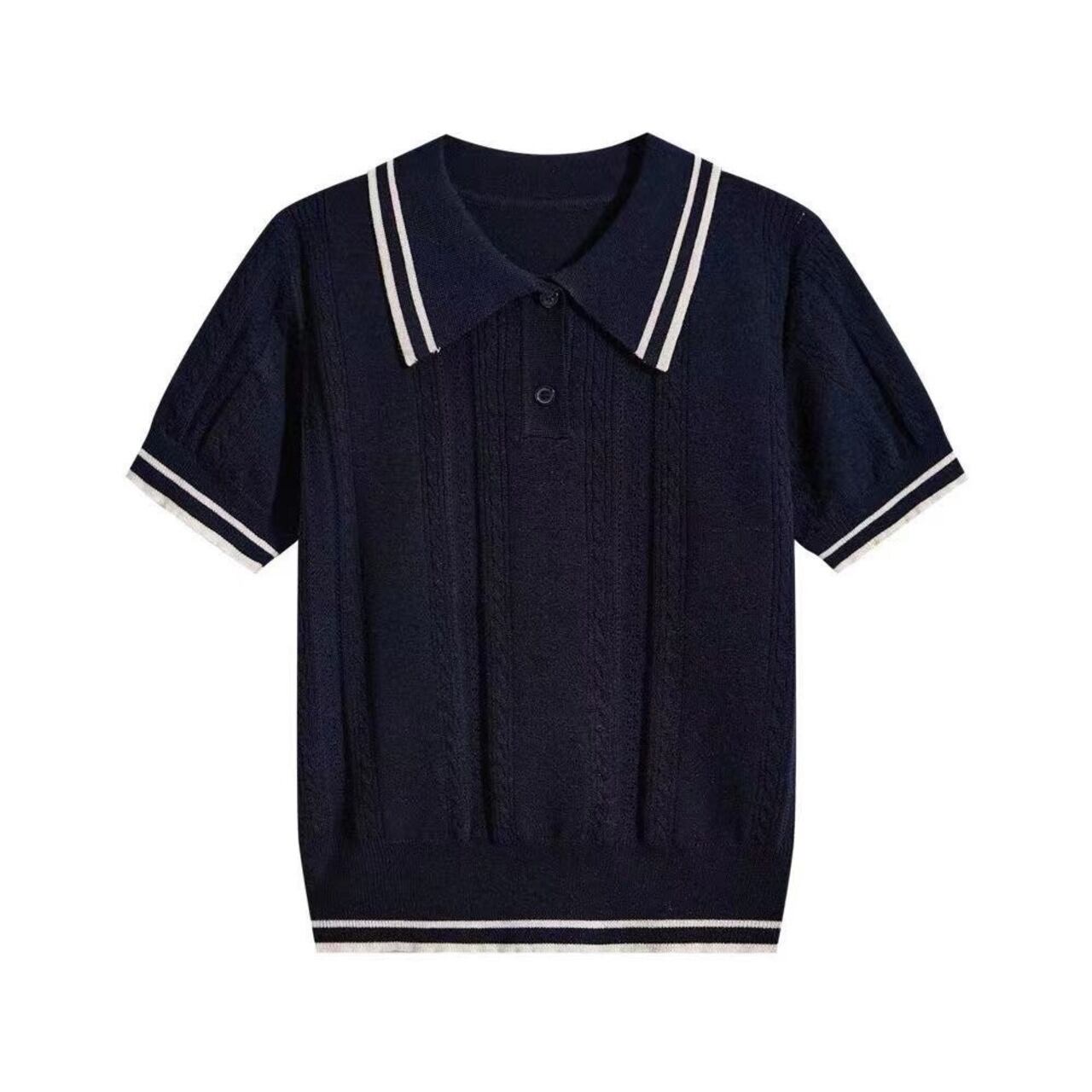 ライン入りニットポロシャツ ポロシャツ ポロ ライン ケーブルニット ポロシャツ レディースライン 薄手 ポロシャツ トップス プチプラ 韓国 C714
