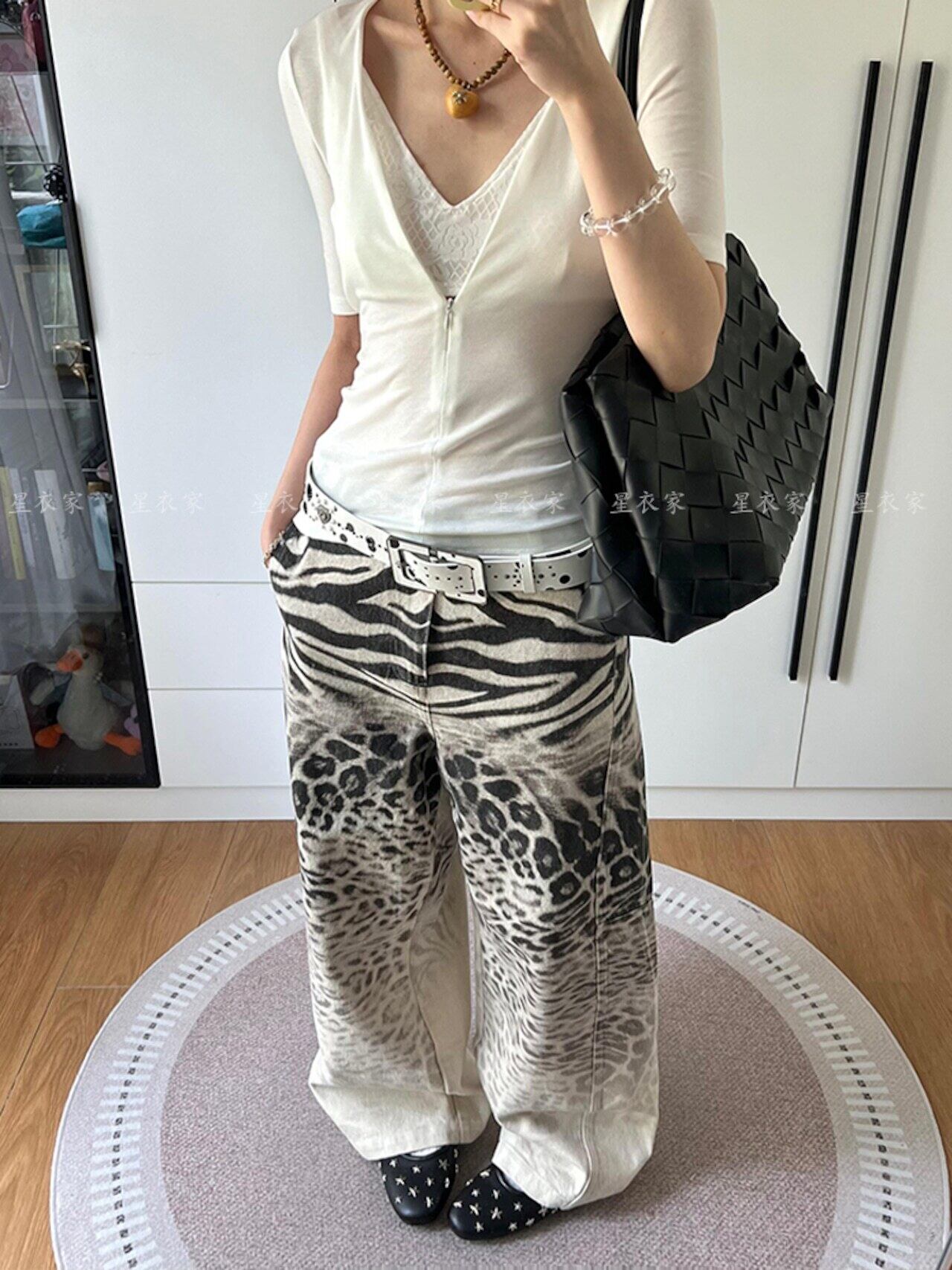 ヒョウ柄グラデーションプリントジーンズ レディース レトロ ルーズ ストレートジーンズ フロアパンツ レディース ジーンズ デニム 10代 20代 30代 40代 y2k ストリートコーデ アメカジコーデ 海外コーデ C635