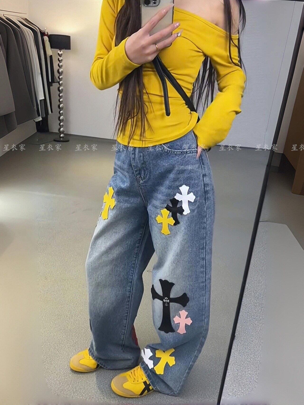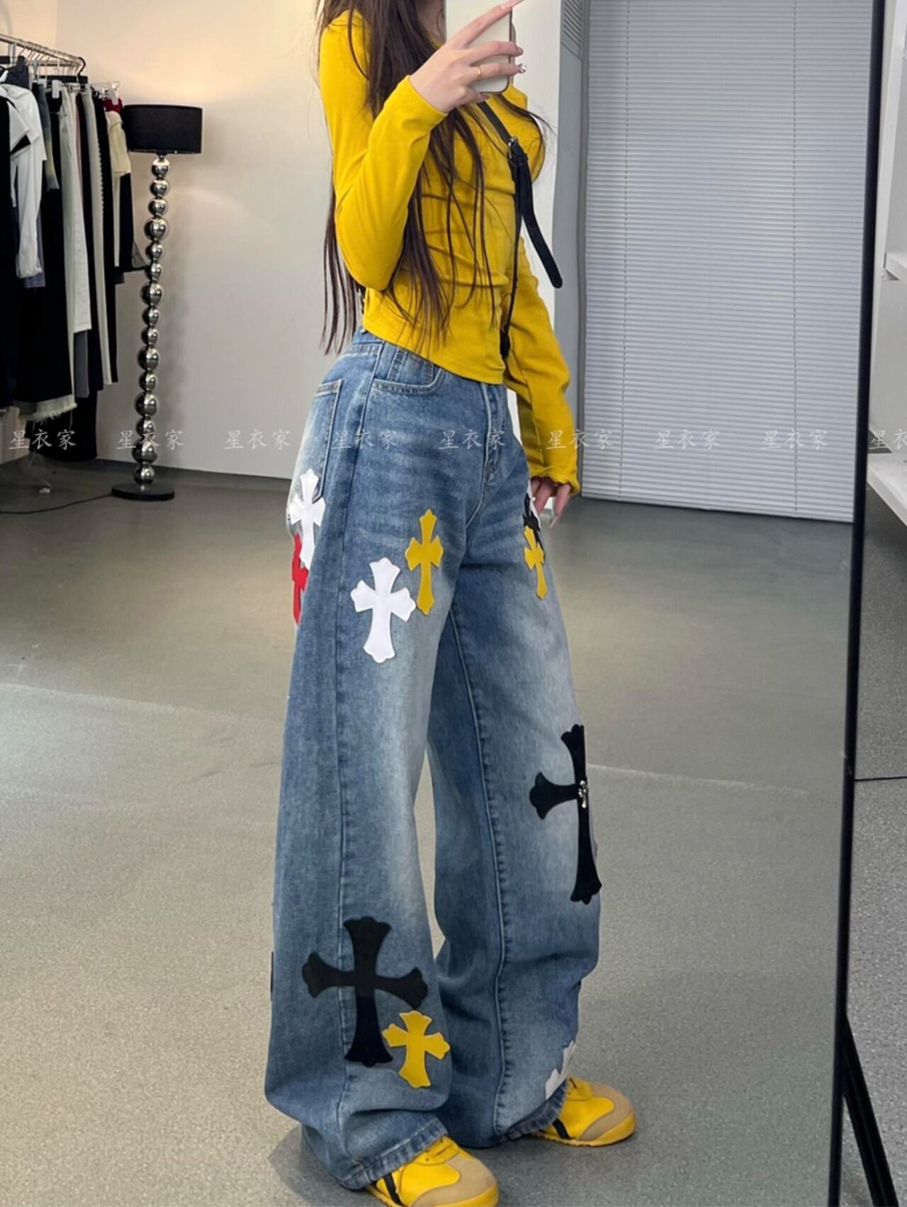 クロスワイドジーンズ 十字架ワッペン レディース ジーンズ デニム ジーパン パンツ ズボン ボトムス 10代 20代 30代 40代 y2k ストリートコーデ アメカジコーデ 海外コーデ C636