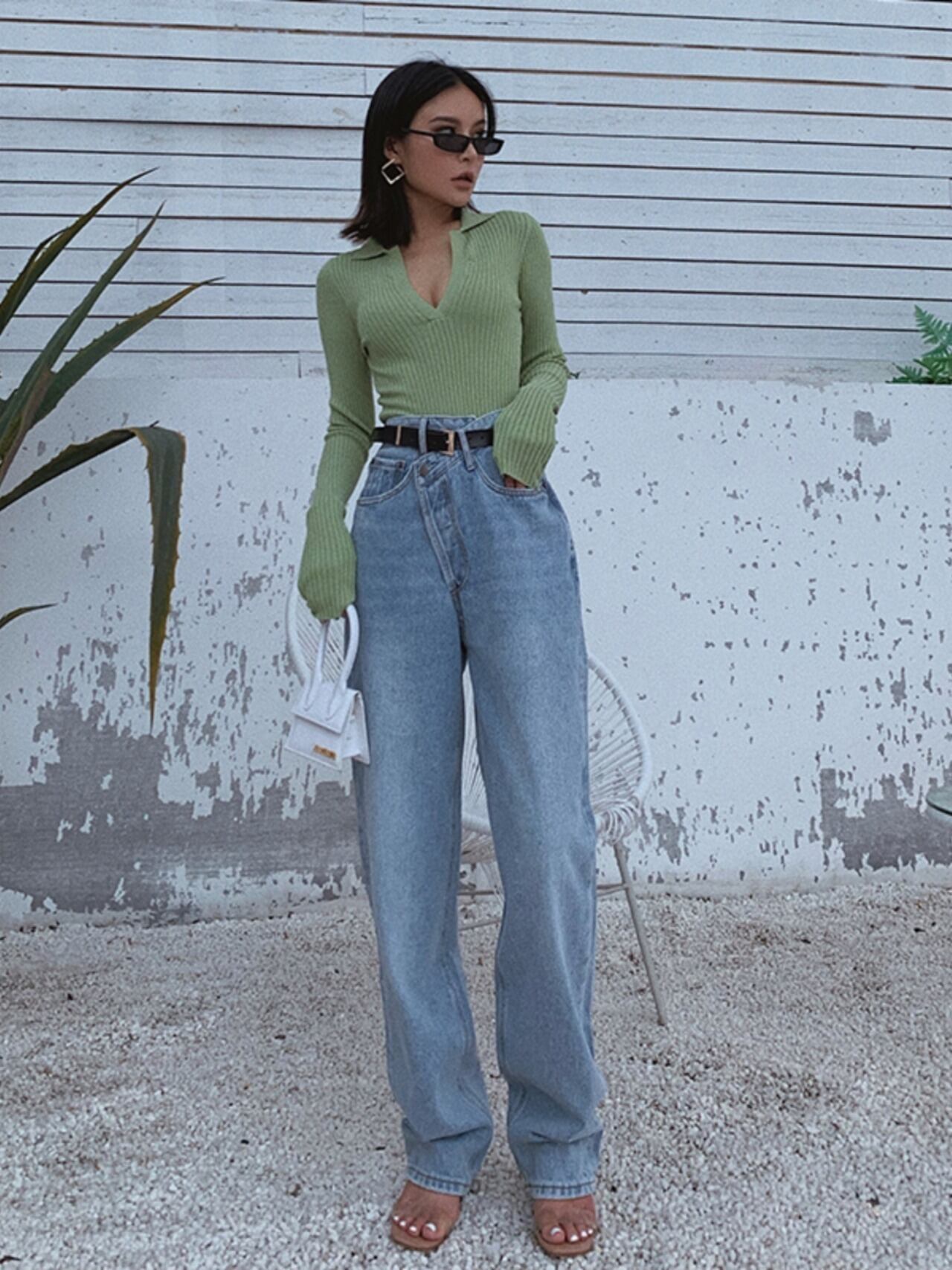 斜めウエストデザインが目を惹く、トレンド感たっぷりの美脚デニムパンツが登場✨