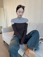 肩を程よく見せるオープンショルダー×ハーフハイネックの組み合わせが、品のあるセクシーさを演出。