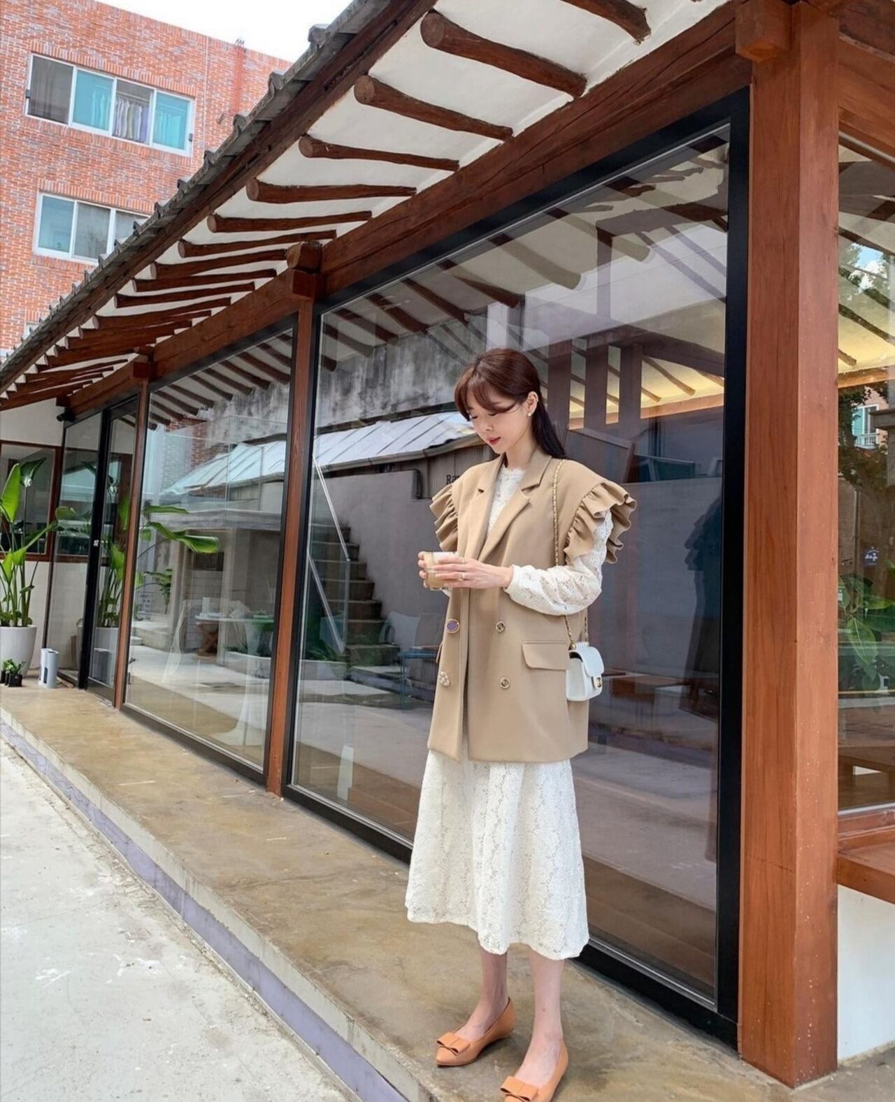 フリルスリーブデザインとダブルボタンが特徴のこのジレは、カジュアルからフォーマルまで幅広く活躍するアイテムです。