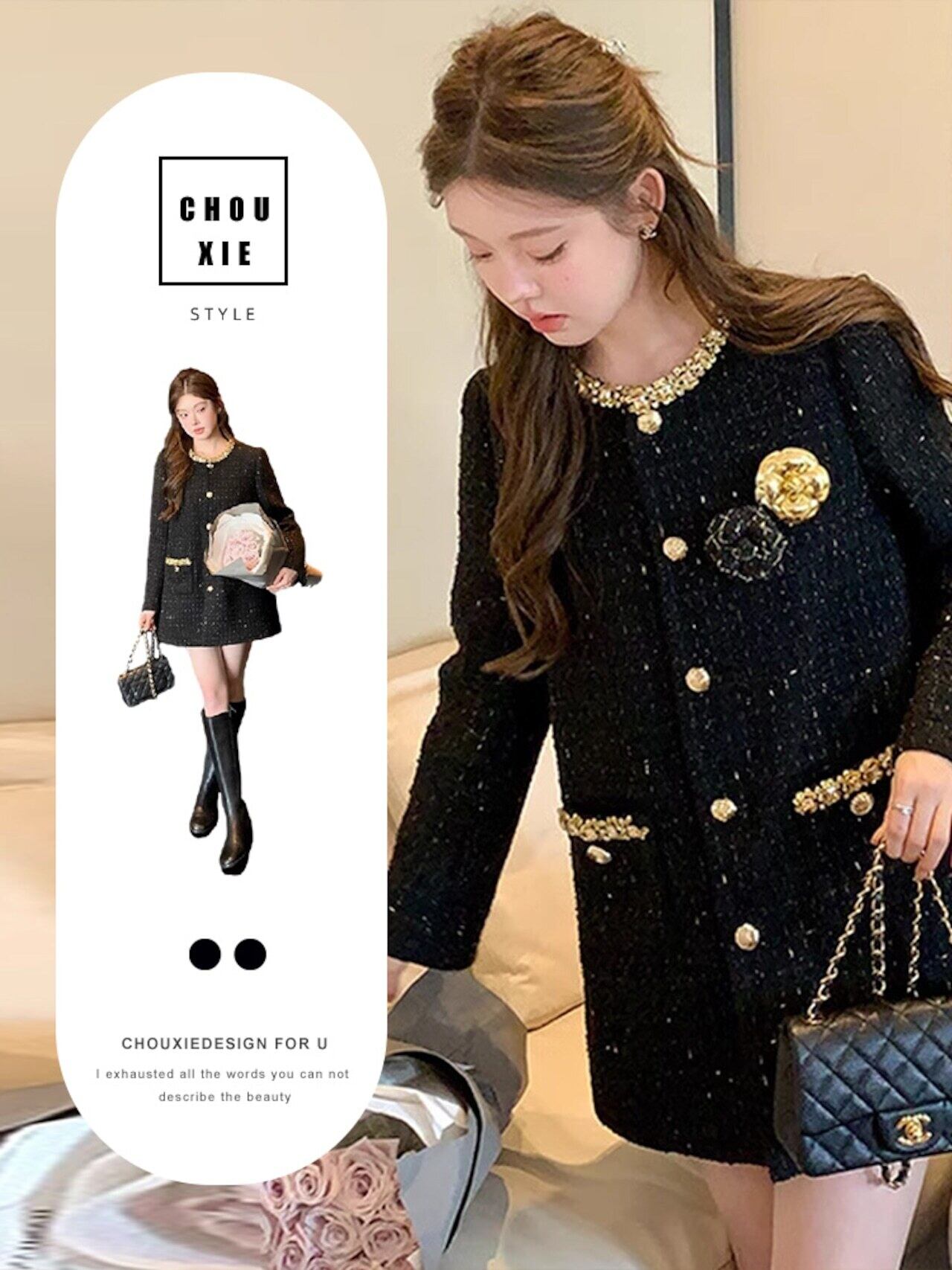 高級感あるツイード素材に、煌めくビジュー装飾&金ボタンを贅沢にあしらったツイードコート
