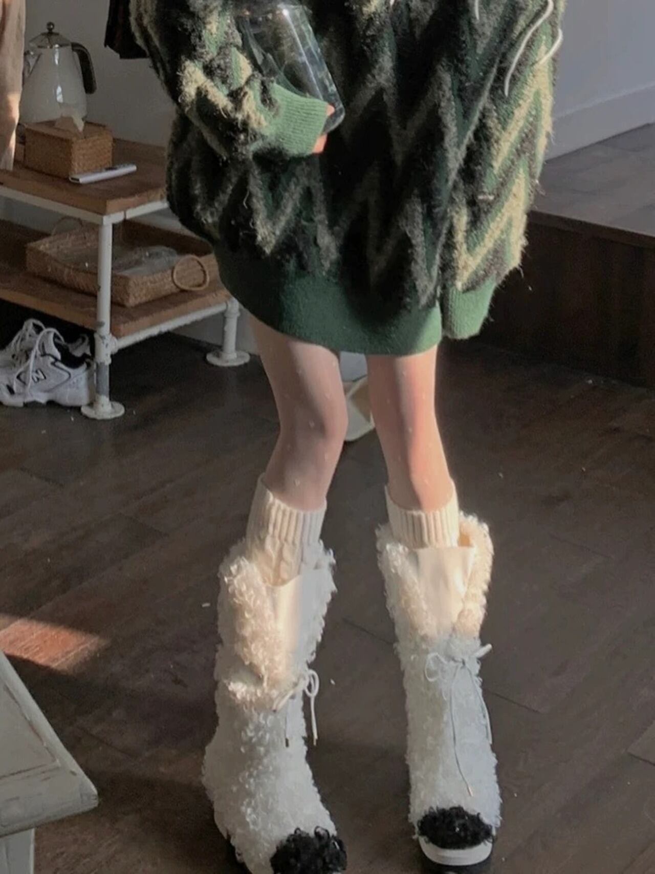 足元をしっかり防寒しながらも、パンダのような白黒デザインが個性的で可愛い印象を演出します。