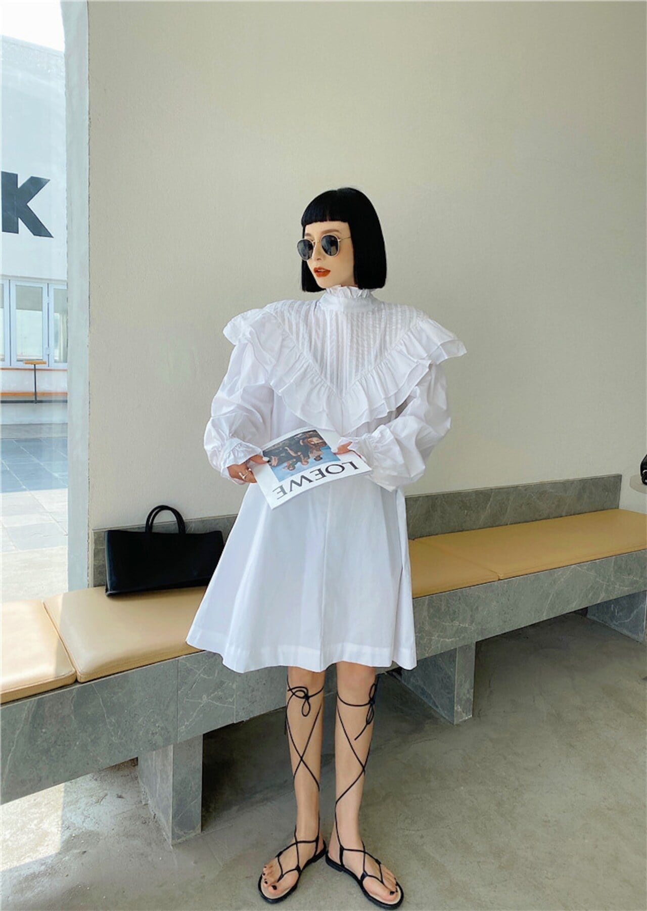 顔まわりを華やかに魅せるフリルとタックデザインが印象的な、ロマンティックなシャツワンピースが登場。