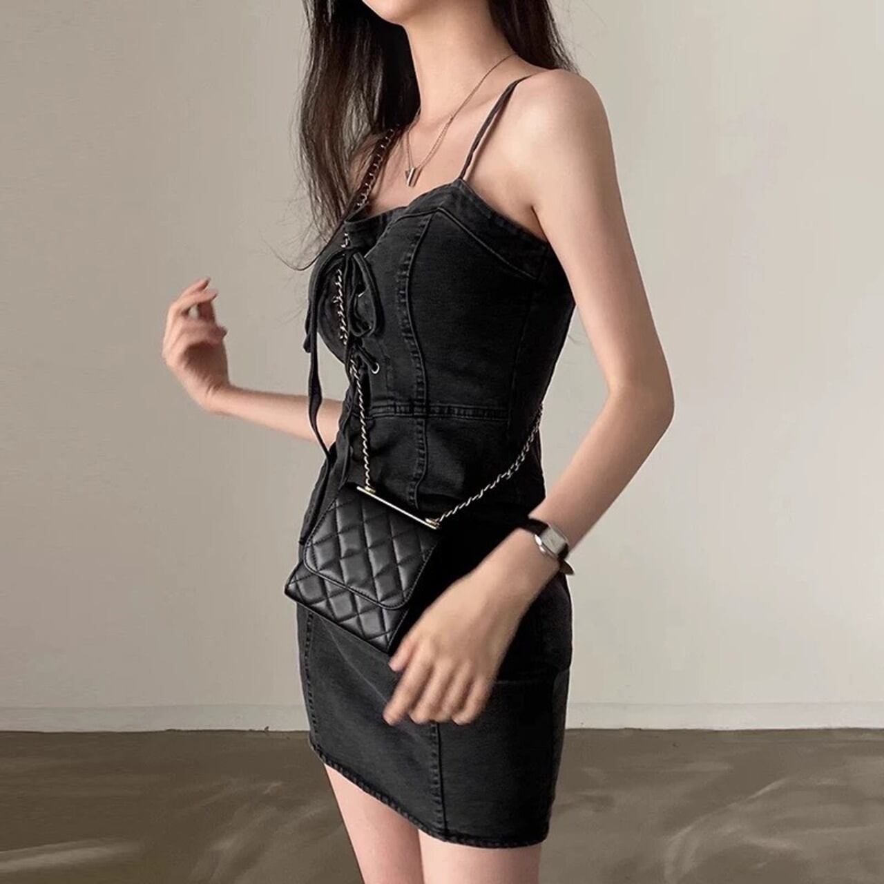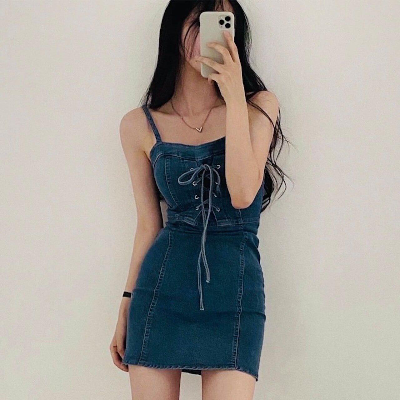 デニムレースアップリボンキャミミニワンピース 美シルエット デニムワンピース レディース タイト ミニ丈 レースアップ キャミワンピ 細見え 着痩せ 夏 きれいめ おしゃれ カジュアルコーデ a3001