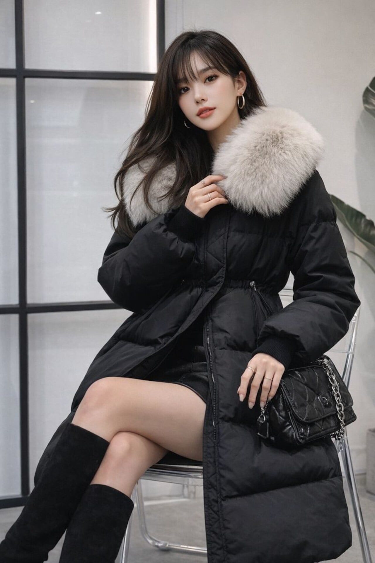 上品なネックファーとブラックボディのコントラストが、洗練された大人の冬コーデを演出します。