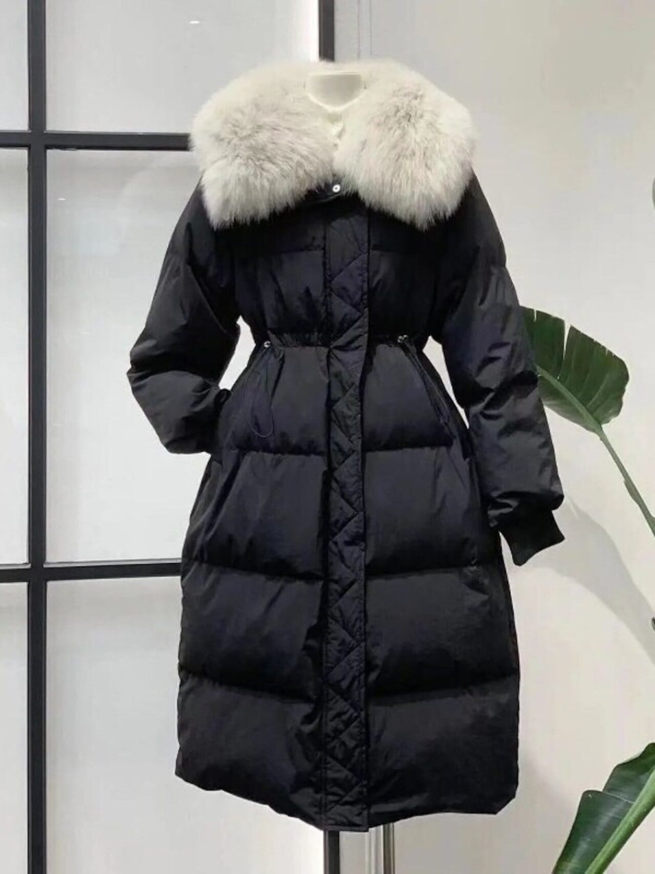 お顔周りのファーが上品な印象を与える、クラシックで女性らしいロングダウンコート
