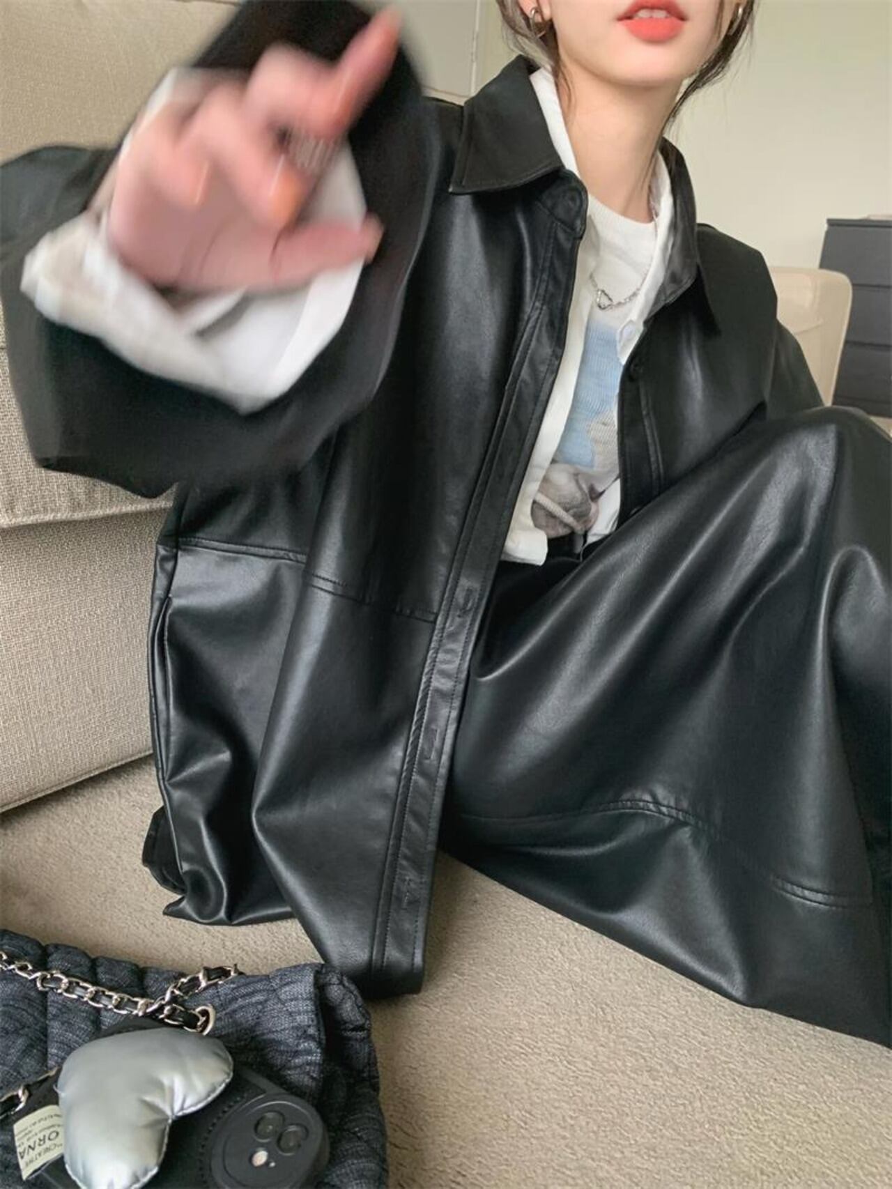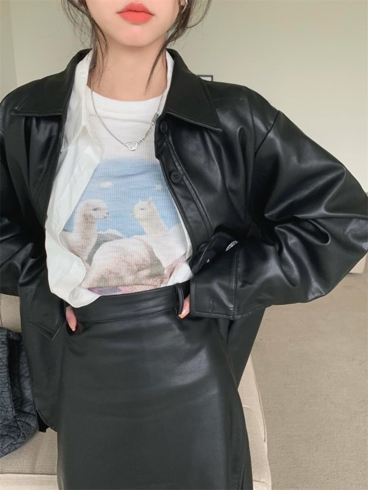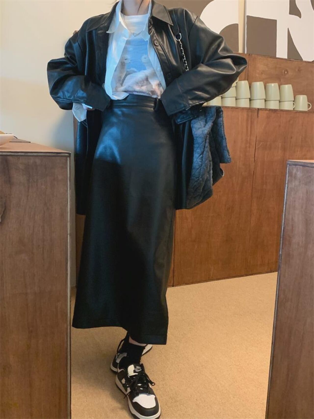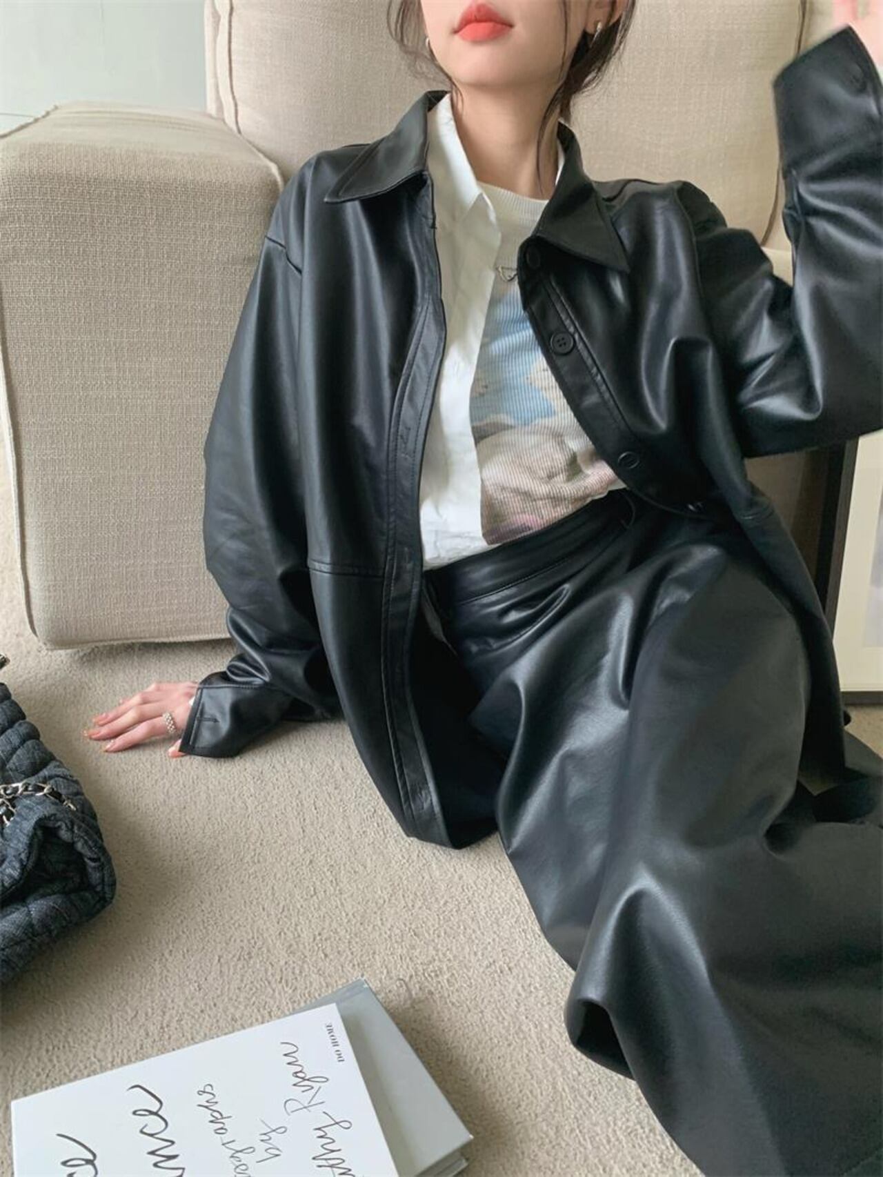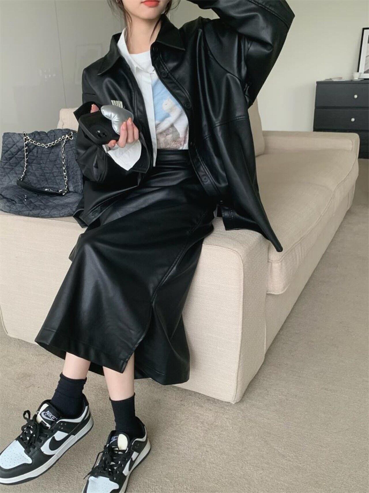 【セットアップ】レザージャケット&ロングスカート上下セット モード系×ストリートMIX 春秋冬コーデ レディース アメカジコーデ set up ブラックコーデ 体型カバー オーバーサイズ C351