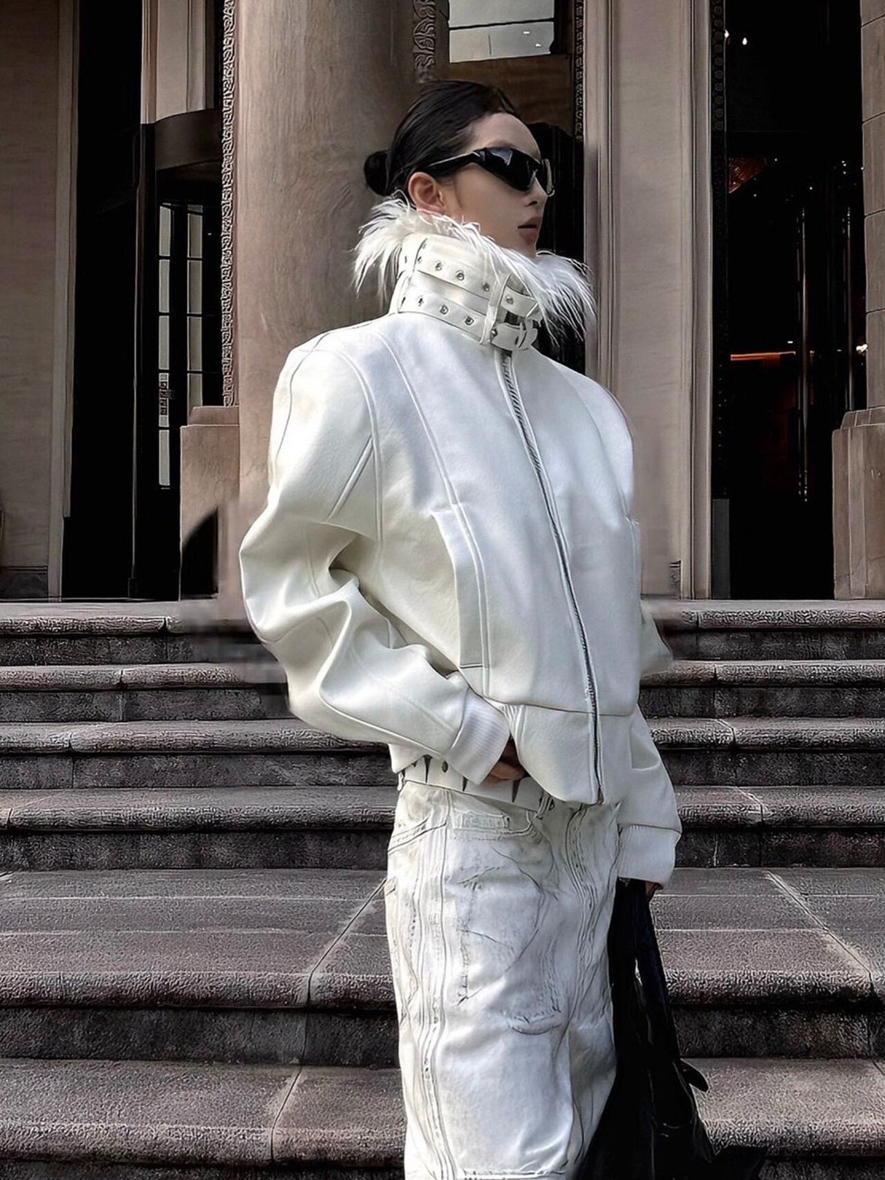 フェザーカラーボリュームホワイトレザージャケット ショートジャケット フェイクレザー ライダースジャケット レザージャケット レディース ハイネック ジップアップ ブルゾン モード系 オーバーサイズ 秋冬アウター ホワイト C394