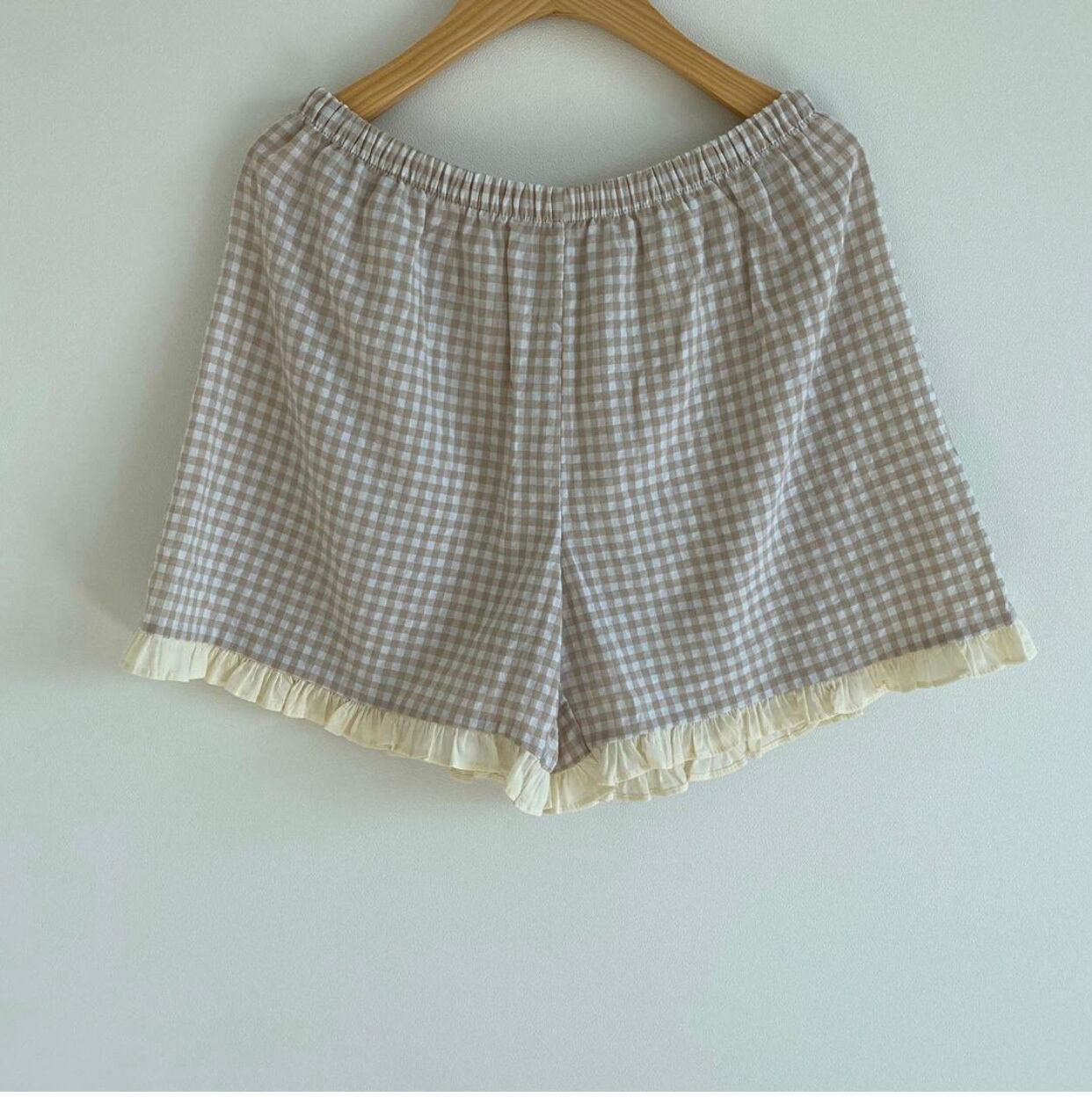 ギンガムチェック柄にフリル使いが可愛いルームウェアです。