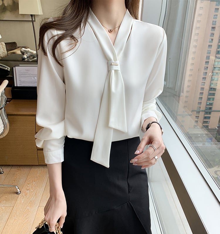 オフィスコーデにぴったりのボウタイサテンブラウス