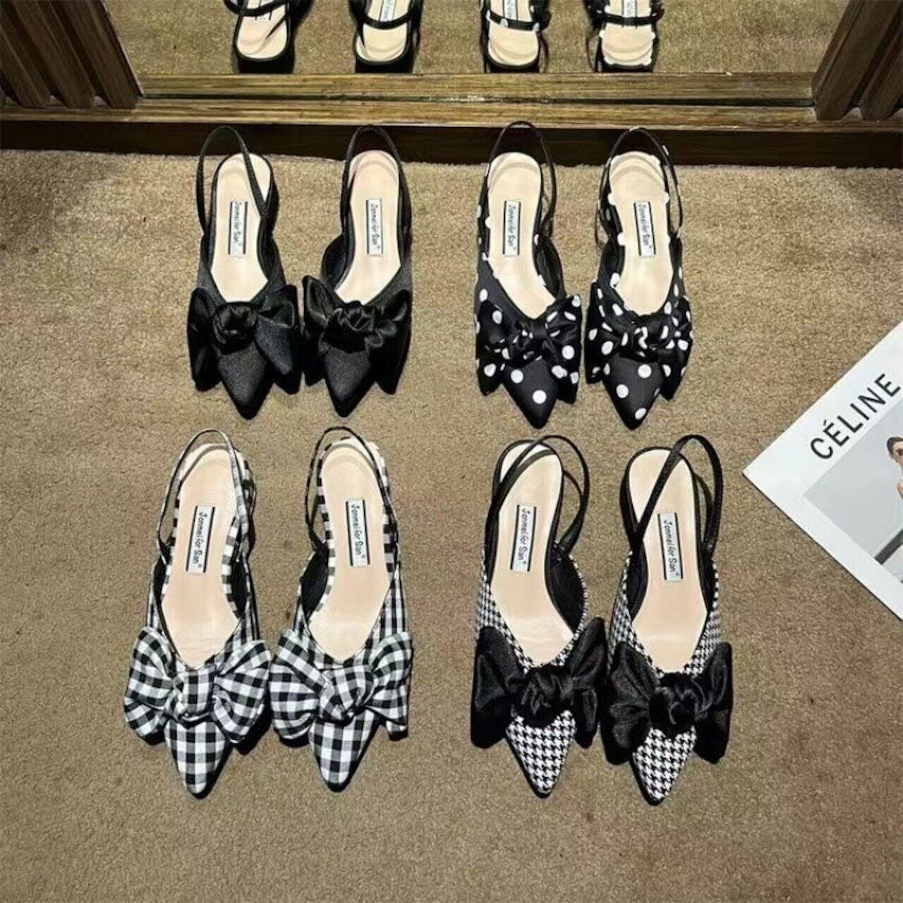リボンパンプス バックストラップ 黒 ヒール 白 ドット 千鳥格子 リボン 痛くない ポインデットトゥ 歩きやすい レディース ローヒール 通勤 パーティー パンプス バックストラップ 黒 ヒール b545