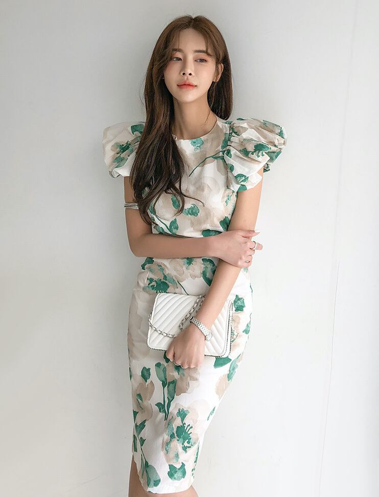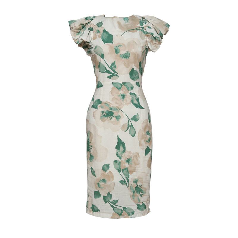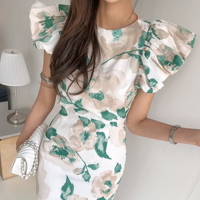 フラワープリント 蓮の葉スリーブ ミドル丈ドレス b400