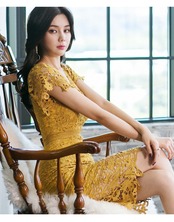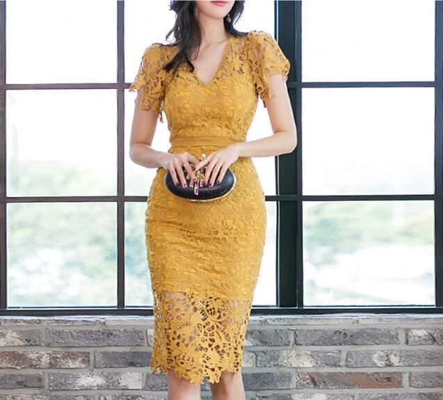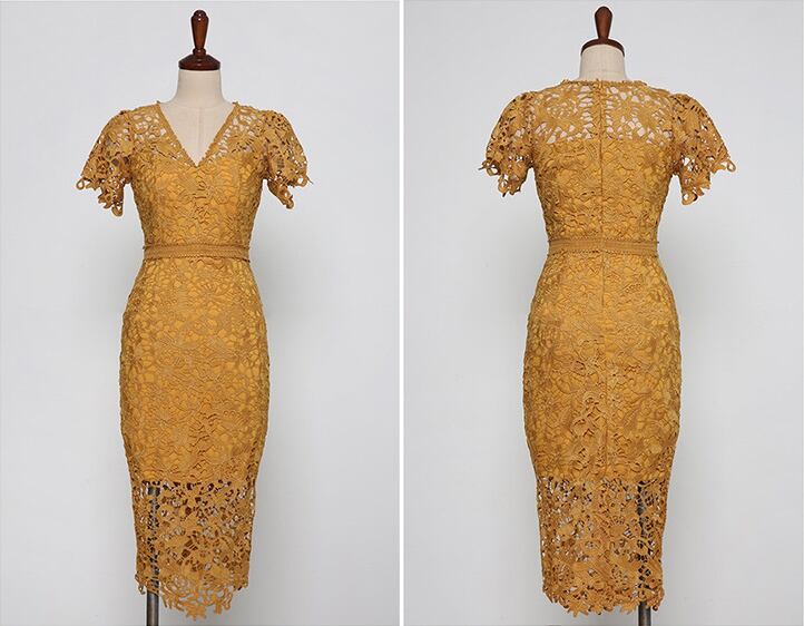 マスタードイエローで落ち着いた雰囲気のVネックレースドレス