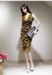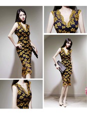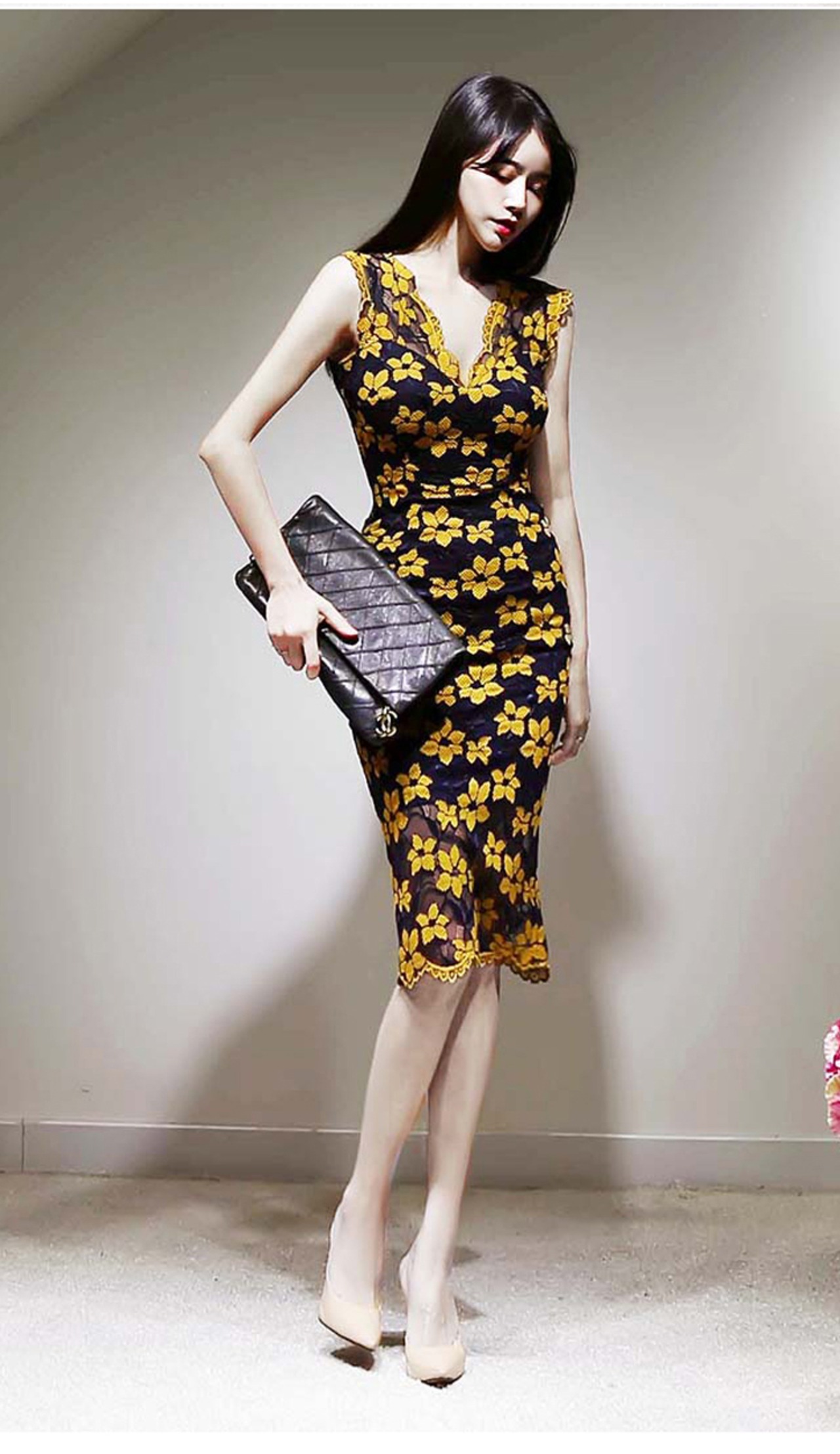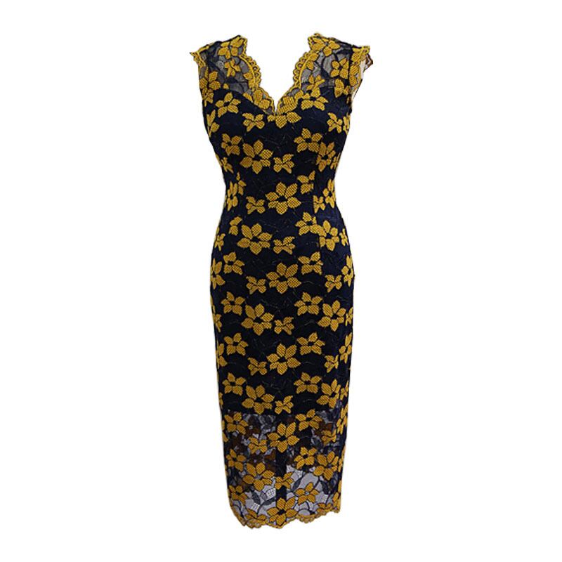 ネイビー×イエローの組み合わせに鮮やかな花柄が一際目を引く総レースドレスです。