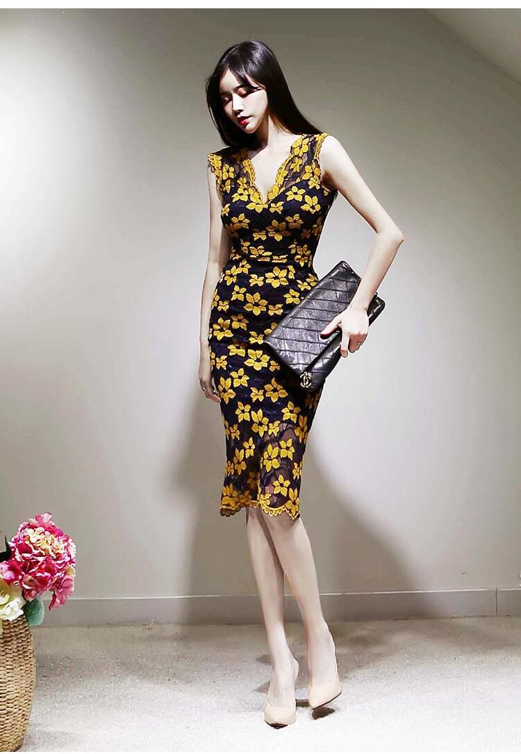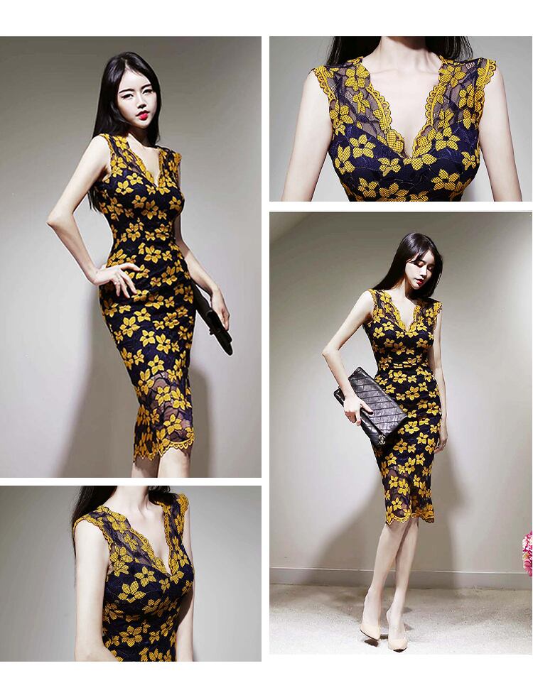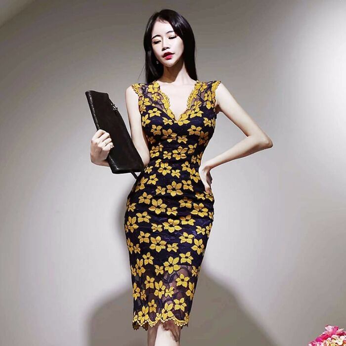 Vネック フラワー総レース ノースリーブ ドレス b422