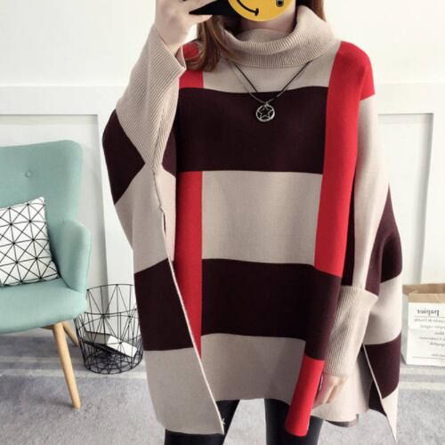 ニット セーター ハイネック タートルネック ドルマン袖 ボーダー チェック スリット ポンチョ プルオーバー サイズ選択可 A1751
