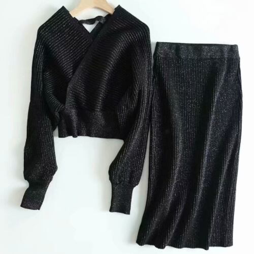 デコルテラインがきれいに見えるVネックトップスとスカートのセットアップアイテムです。