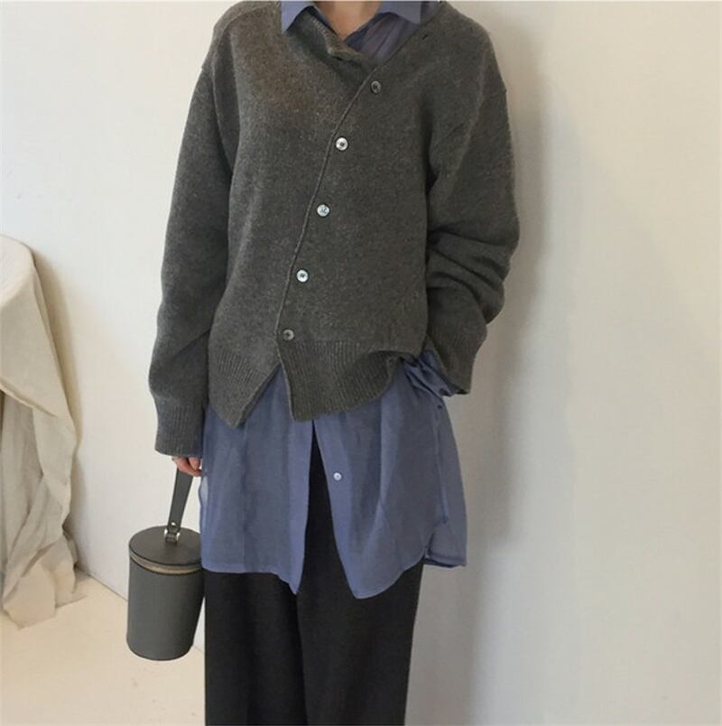 長袖ニットカーディガン 斜めのバックル セータージャケット A2061