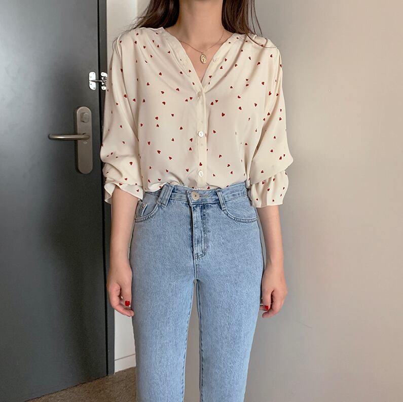ハートドット柄 シフォンブラウス ドット柄ブラウス トップス Vネック 3カラー a254