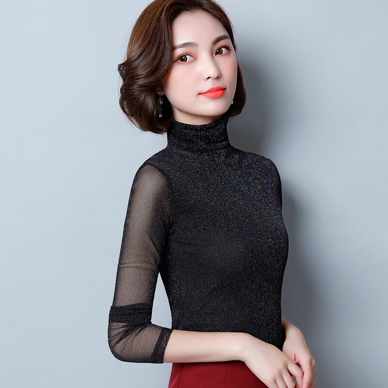 女性 セクシー 長袖 ニット カジュアル ブラウス タートルネック メッシュ トップス A358