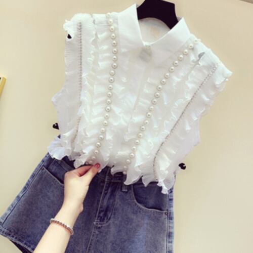パールパッチワーク フリルノースリーブブラウス 2色展開 A2126