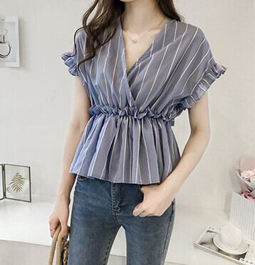 ストライプ Vネック ブラウス フレア袖 トップス ウエストゴム おしゃれ 薄手 a274