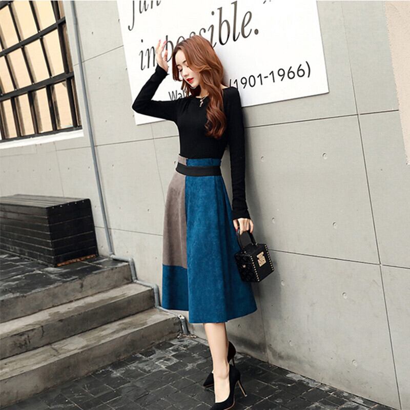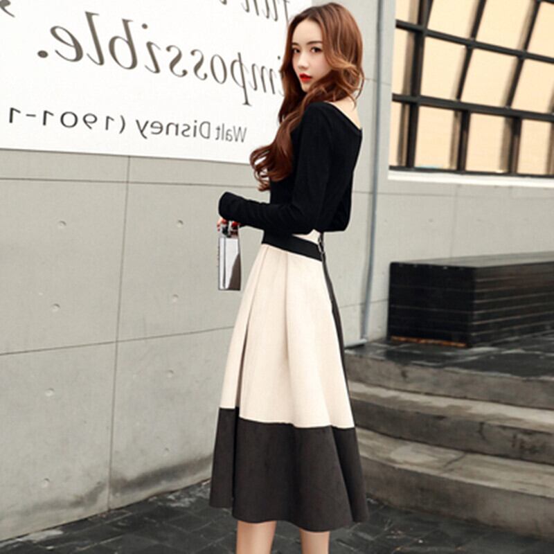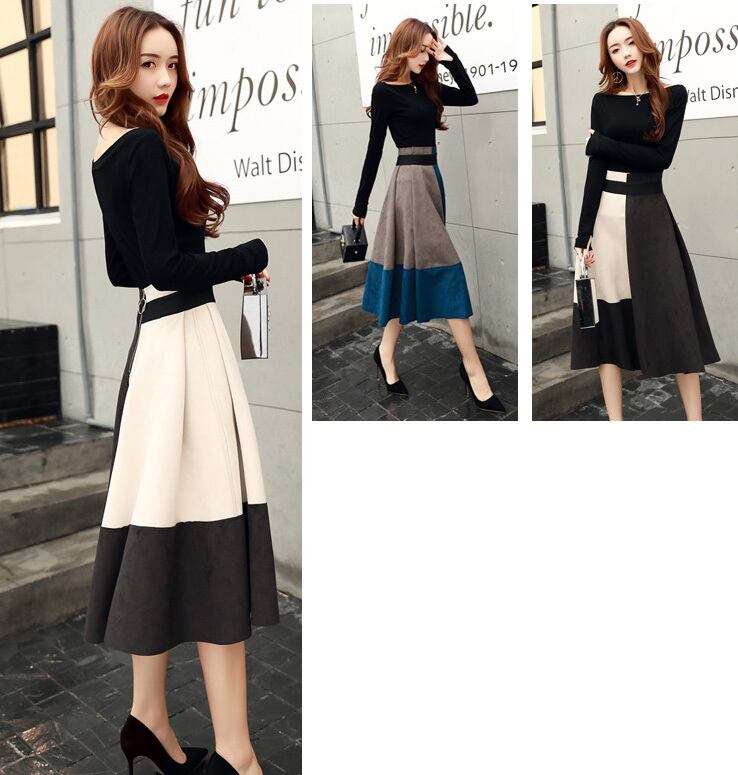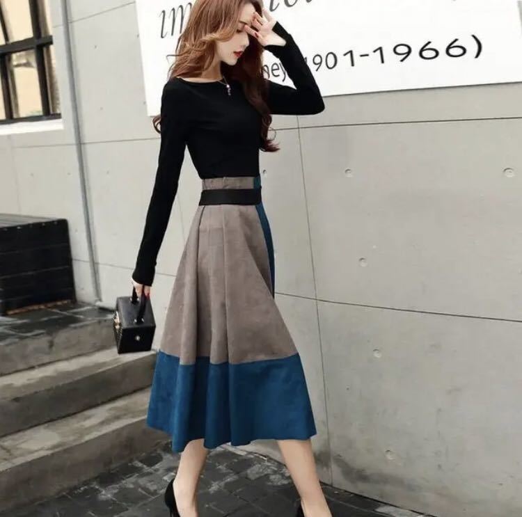 バイカラーの配色デザインが印象的なミモレ丈スカートと黒のトップスの2点セットです。
