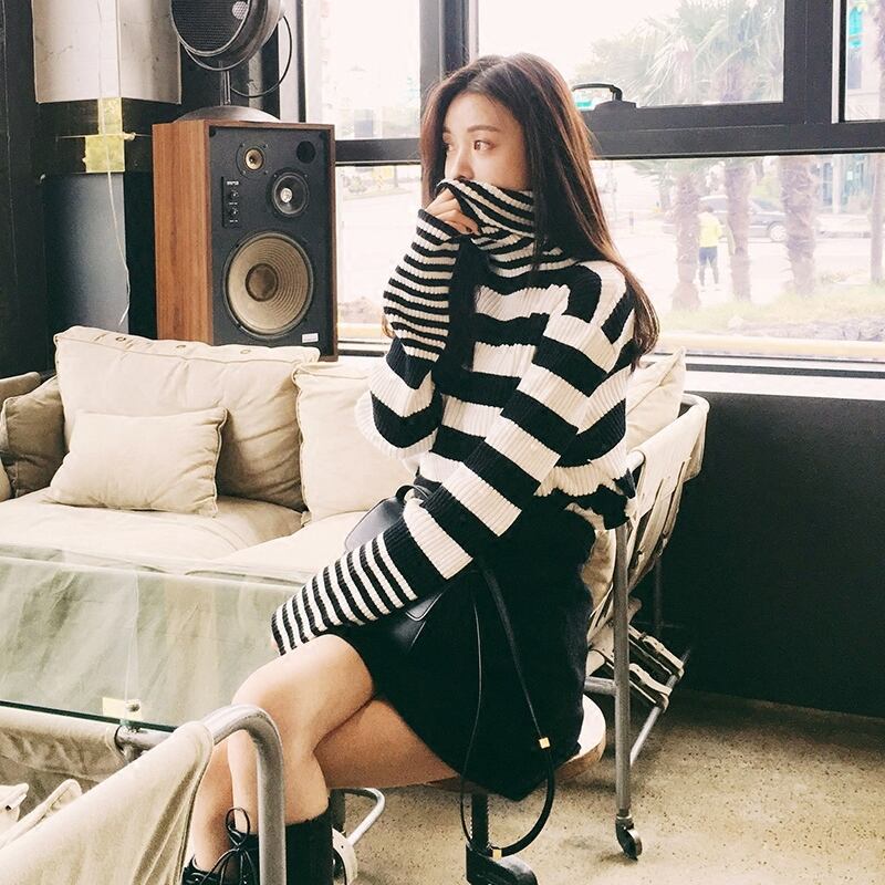大きさの違うMIXボーダーが可愛いタートルネックのニットです。