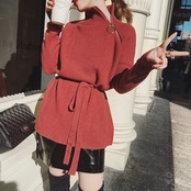 ハイネック ニット セーター ウエストリボン トップス ワンピース ファスナー付き 3カラー a406