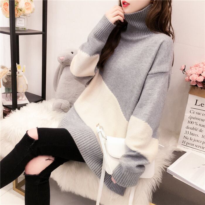 ハイネック ニット セーター タートルネック バイカラー ミドル丈 ルーズ a414
