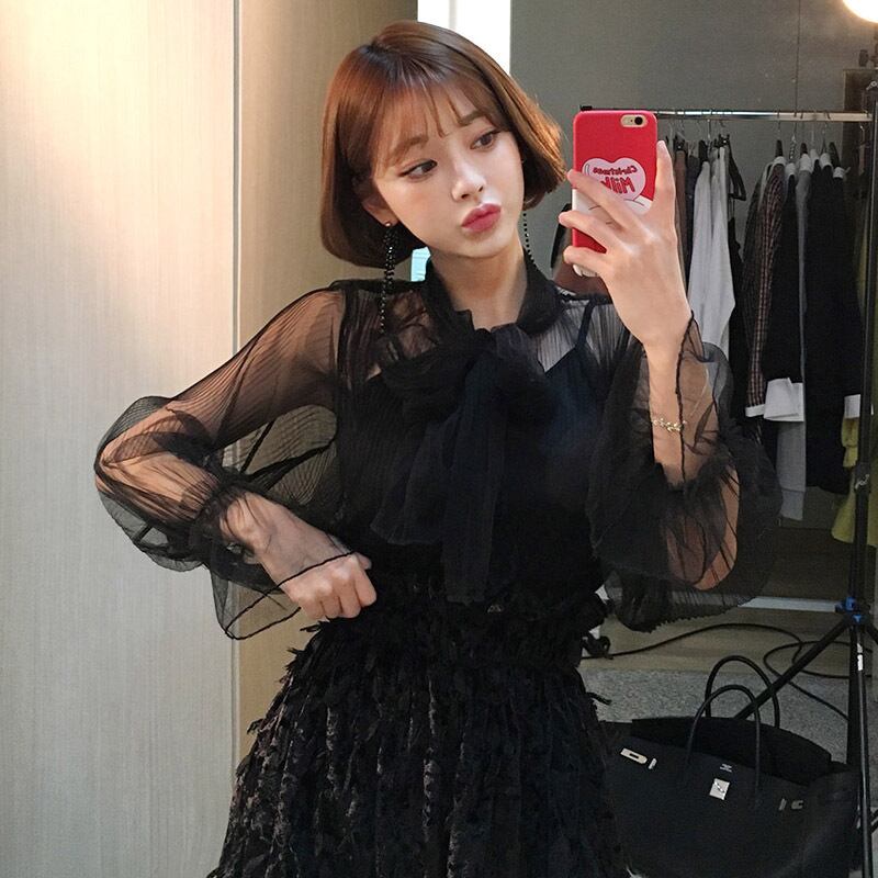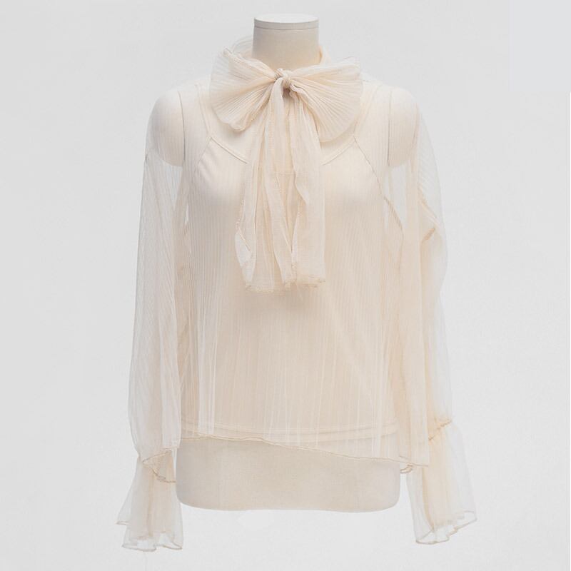 【セット】キャミソール+シフォンブラウス リボン トランペットスリーブ シースルー袖 a427