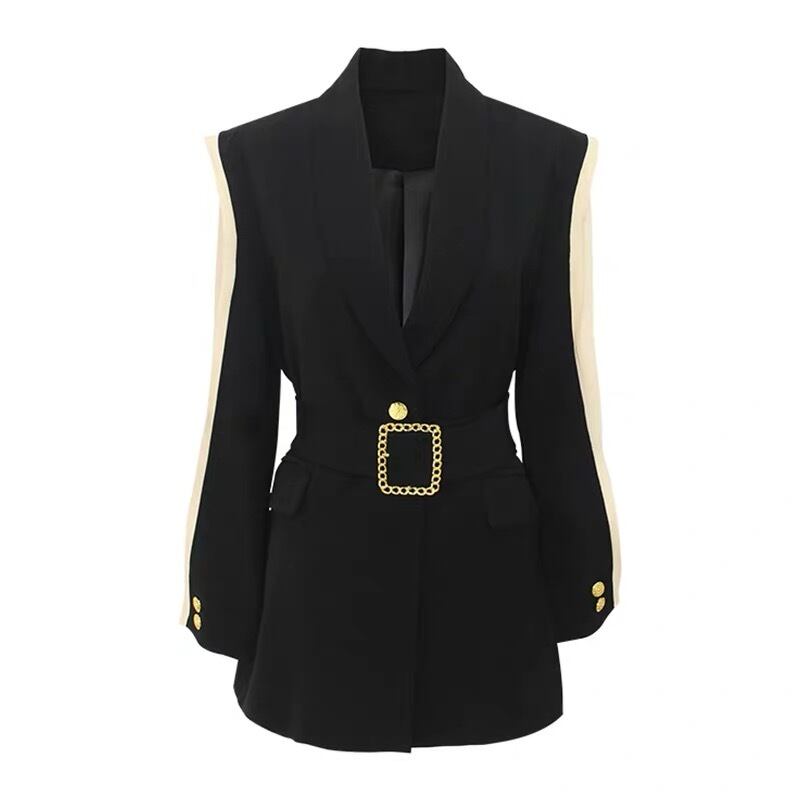 【日本未発売】Vネック シフォンスリーブ ジャケット ウエストベルト スリム ミドル丈 a410