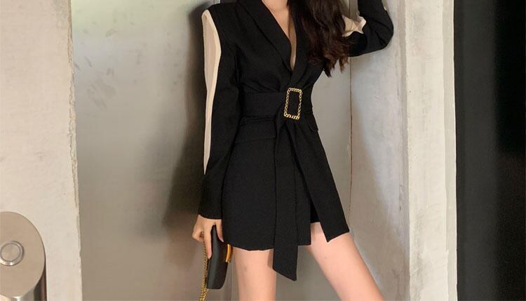 深めのVネックで大人っぽい印象を与えてくれるウエストベルト付きジャケットです。
