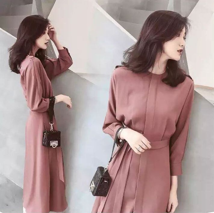 Aラインスカートフェミニン ワンピース ウエストリボン ラウンドネック ハイウエスト a418