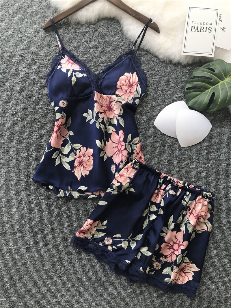 夏♪セクシー ♪シミュレーションシルク♪キャミソール♪花柄 ♪2点セット♪半パンツ♪パジャマA455