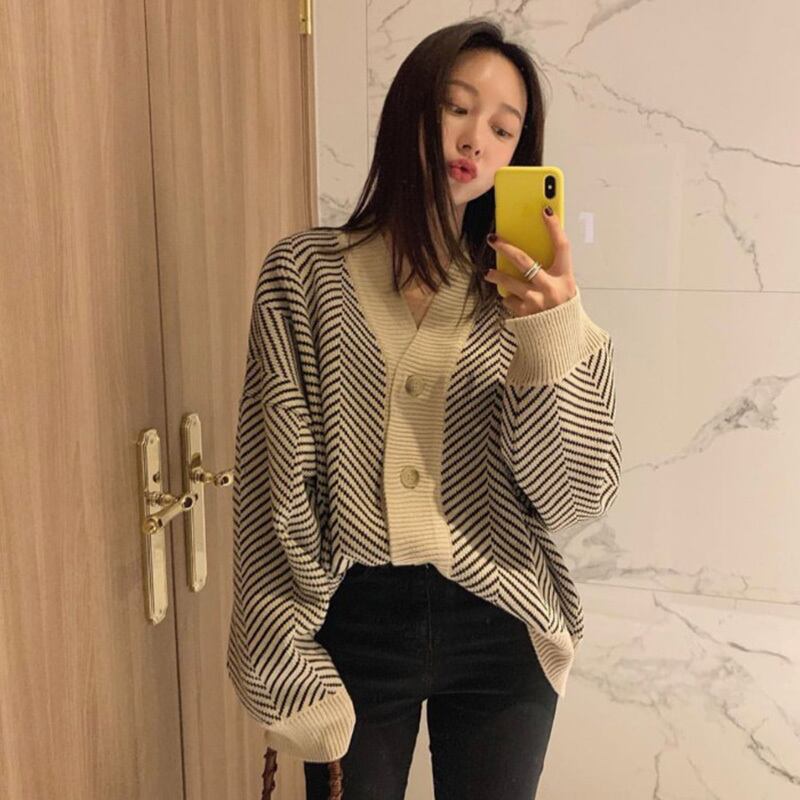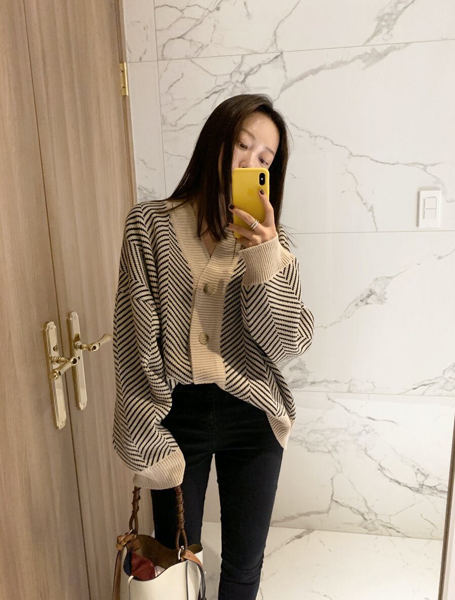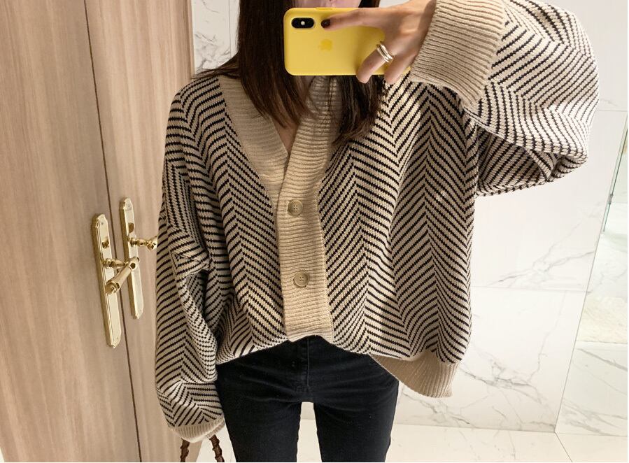 Vネック シングルブレスト ルーズ カーディガン セーター ジャケット レトロ a516