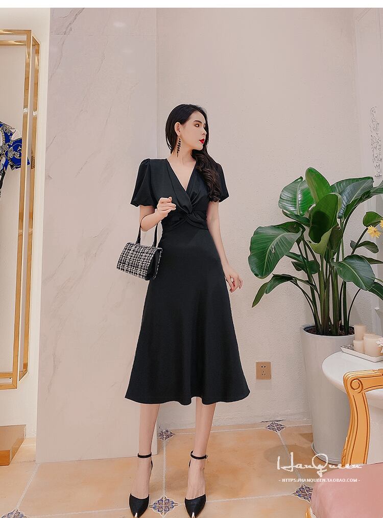 サテンドレス vネック ワンピース フレンチスタイル スリムウエスト パフスリーブ 3カラー a520