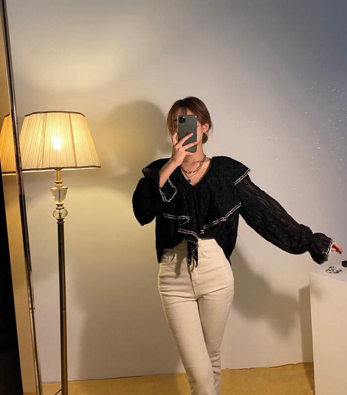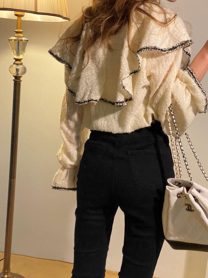 【日本未発売】レース ブラウス フリル襟 トランペットスリーブ フェミニン シャツ トップス 2カラー a506