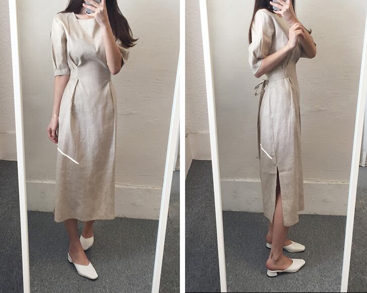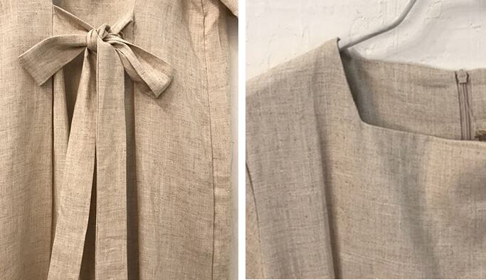 スクエアネック リネンワンピース ドレス レトロ ウエストリボン 2カラー a507