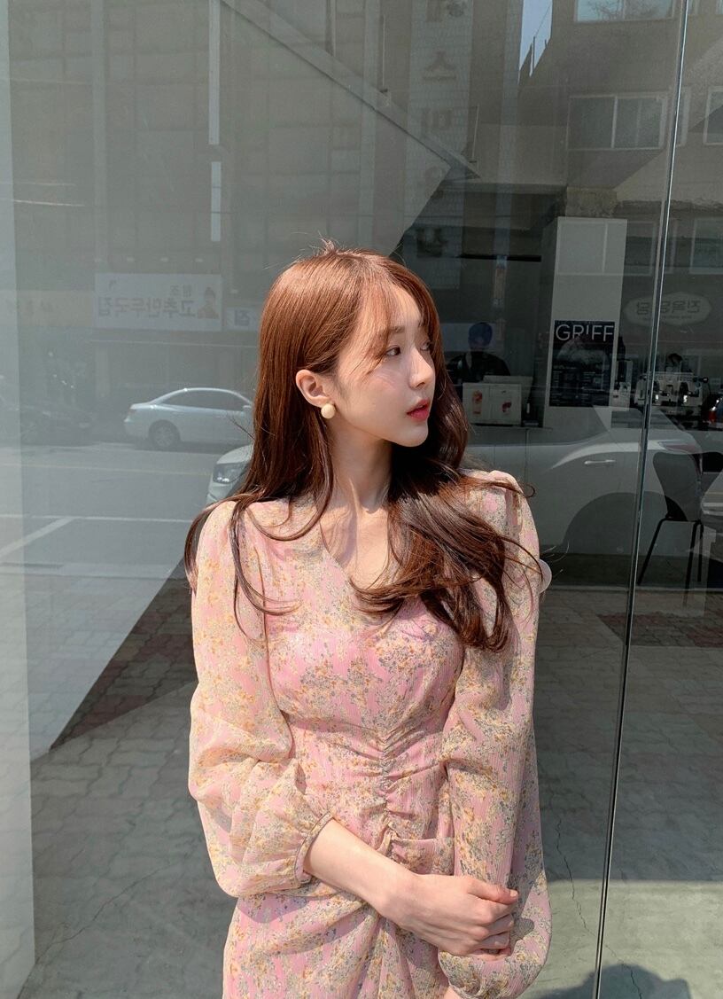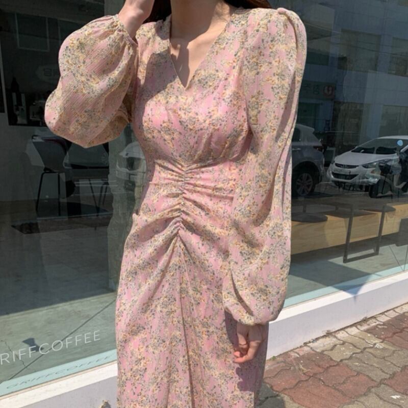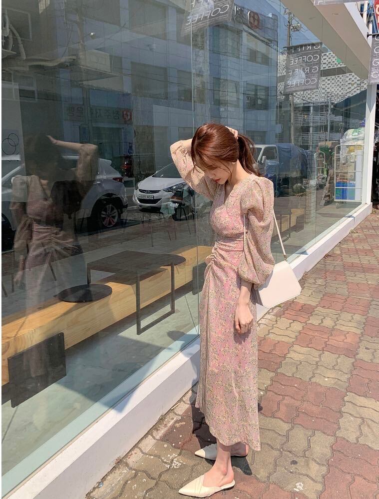 Vネック シフォンワンピース フローラル ハイウエスト バックリボン ドレス 韓国 a526