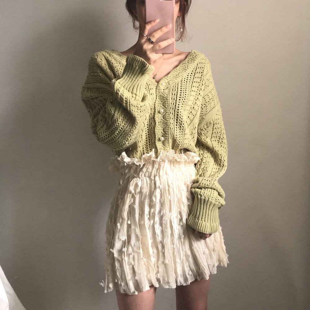 Vネック セーター ニット カーディガン かぎ針編み パンチングレース パール レース 韓国 a532