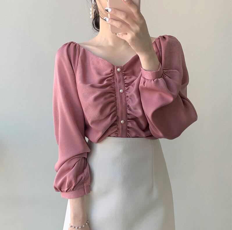 Vネック ブラウス 長袖 シフォンシャツ 韓国 ルーズ オールマッチ パール 2カラー a536